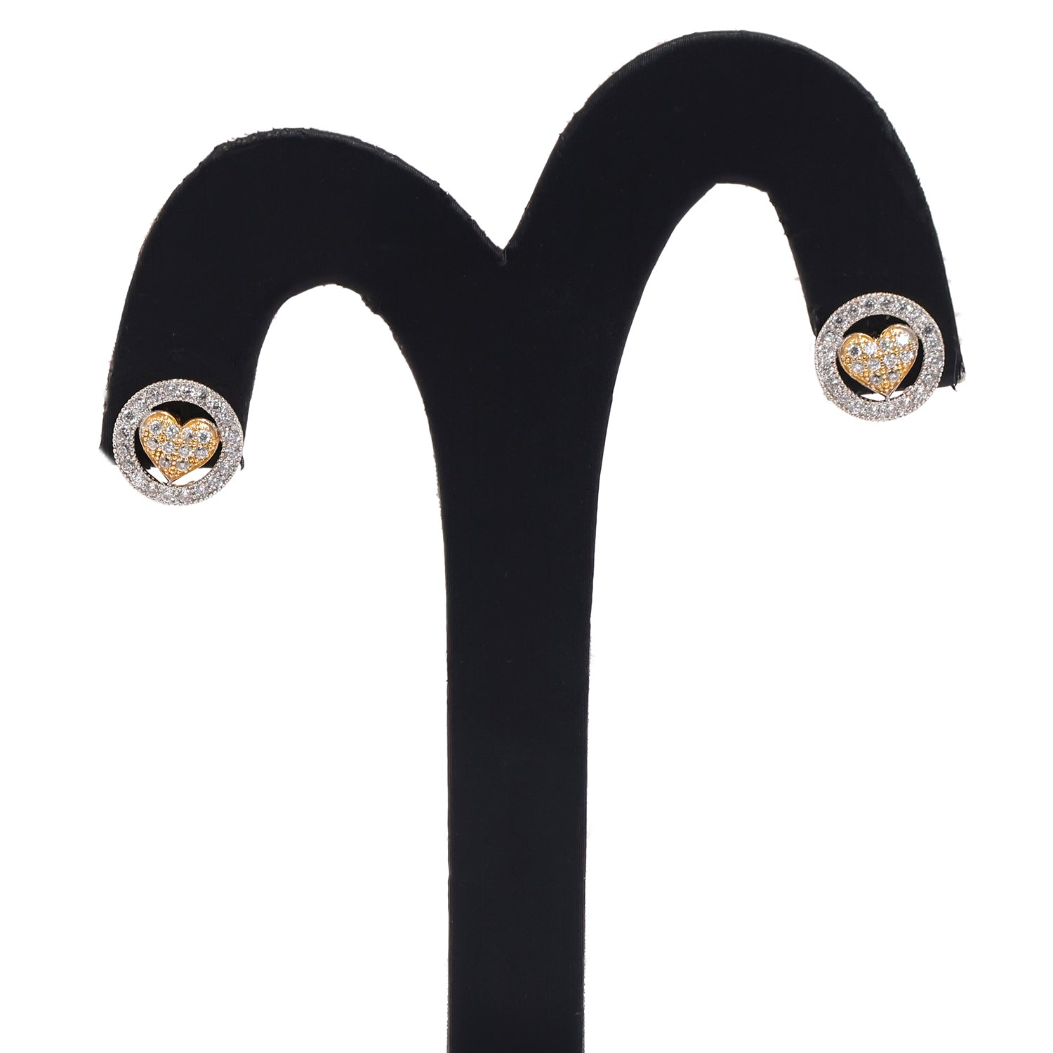 18K Gold Earrings with Two-Tone Heart  Circle CZ Design - Full View