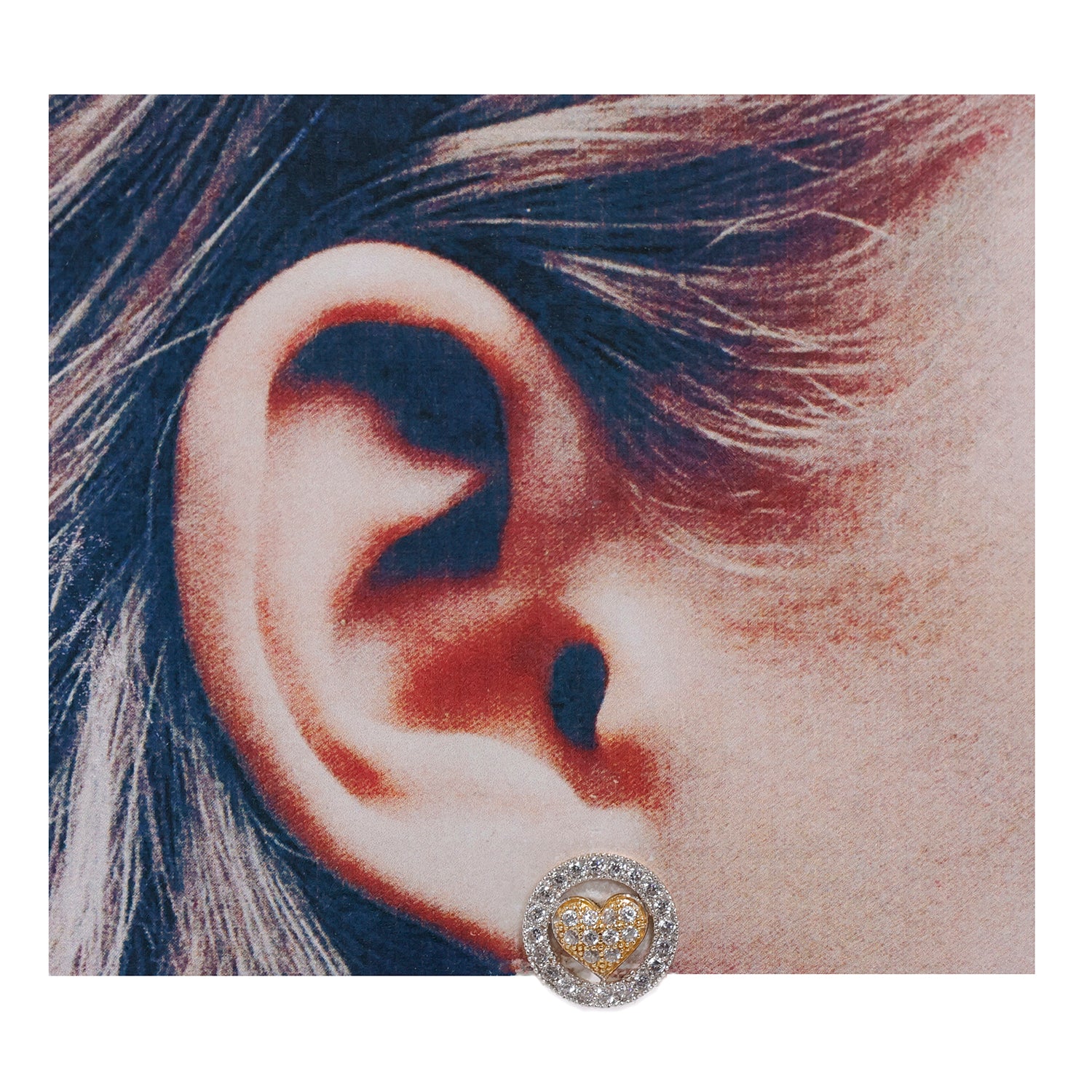 18K Gold Earrings with Two-Tone Heart  Circle CZ Design - Close View