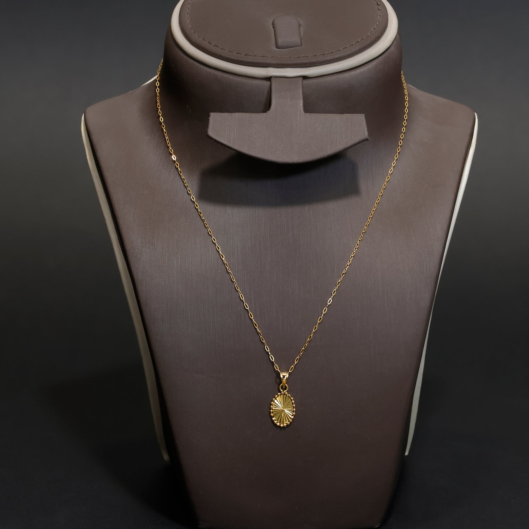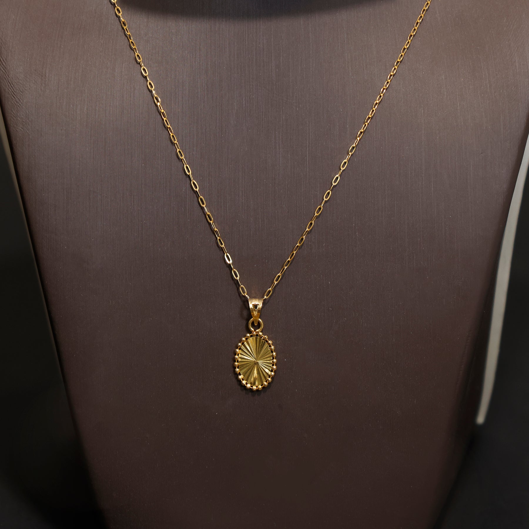 Illuminate your style with this stunning 21K Gold Necklace, featuring a beautifully detailed sunburst oval pendant. The radiant sun-inspired pattern symbolizes energy, positivity, and new beginnings, making it a meaningful piece for your jewelry collection.