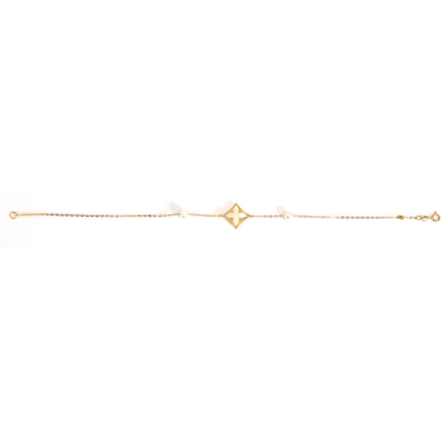 This 18K gold bracelet is designed with a sleek central star-shaped motif framed by two pearl-like stations, offering a subtle sparkle that elevates everyday styling.