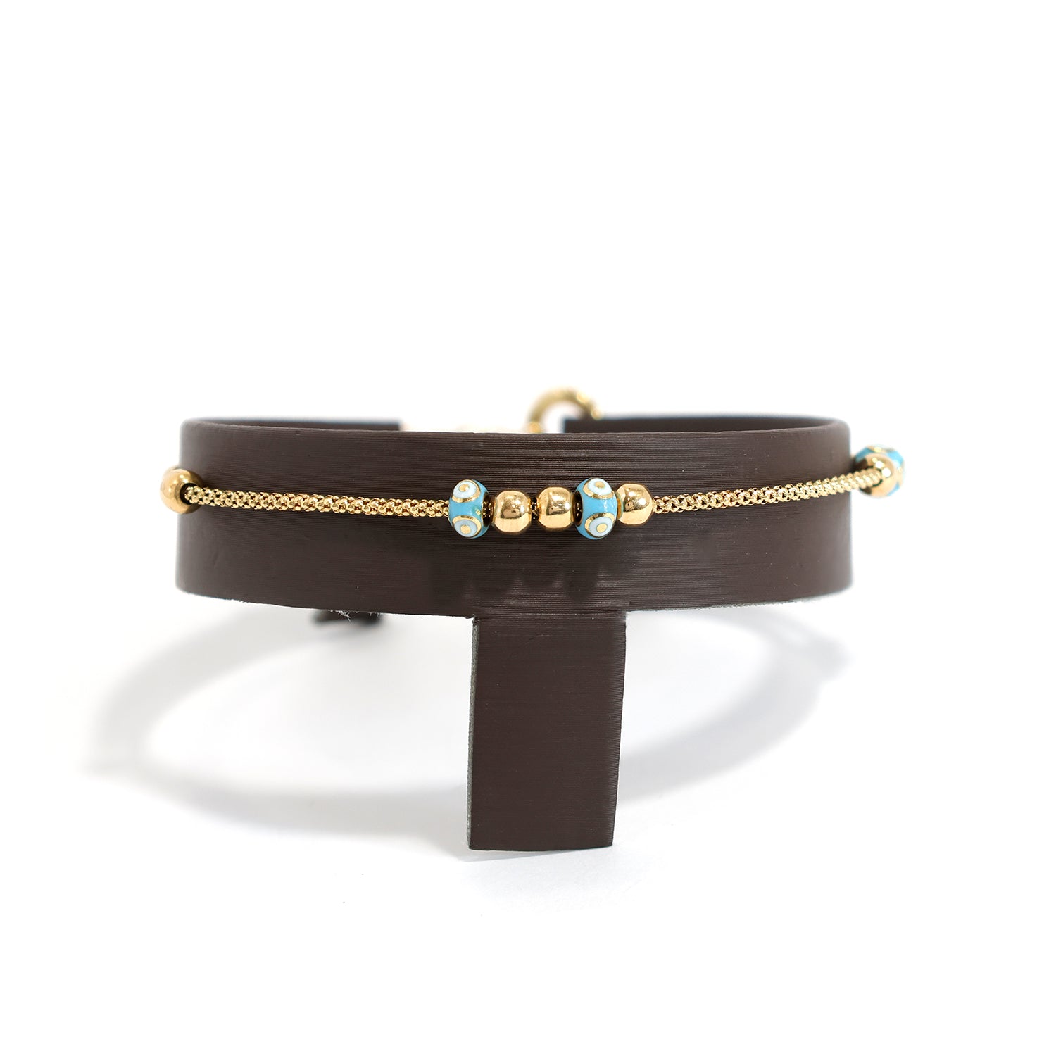 18K Gold Bracelet – Slim Chain with Blue Patterned Bead Accents - Main View