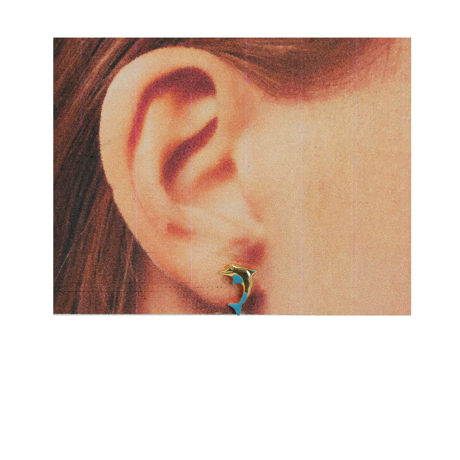 Charming 18K gold dolphin stud earrings featuring vibrant blue enamel detailing. A playful yet elegant choice for daily wear or gifting.