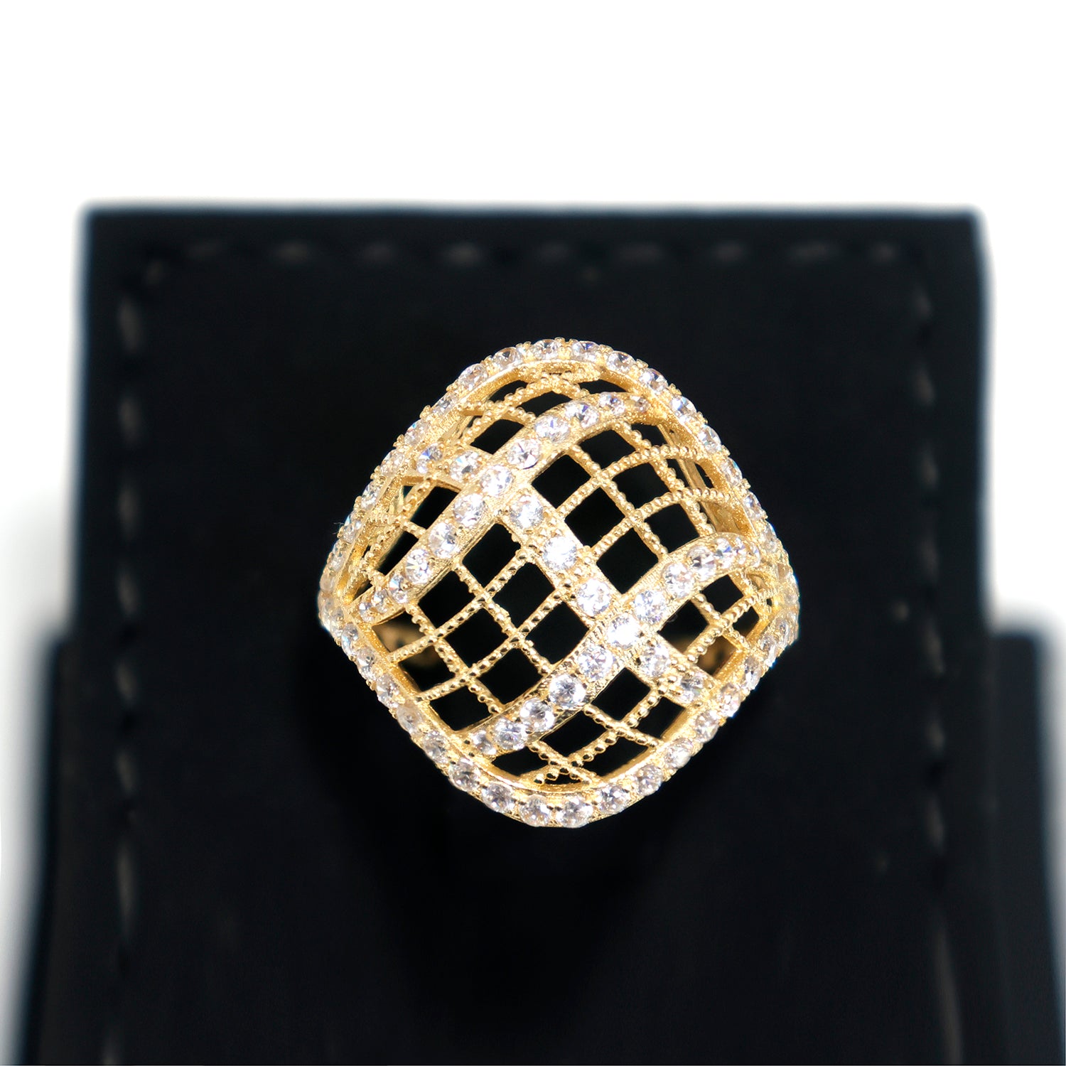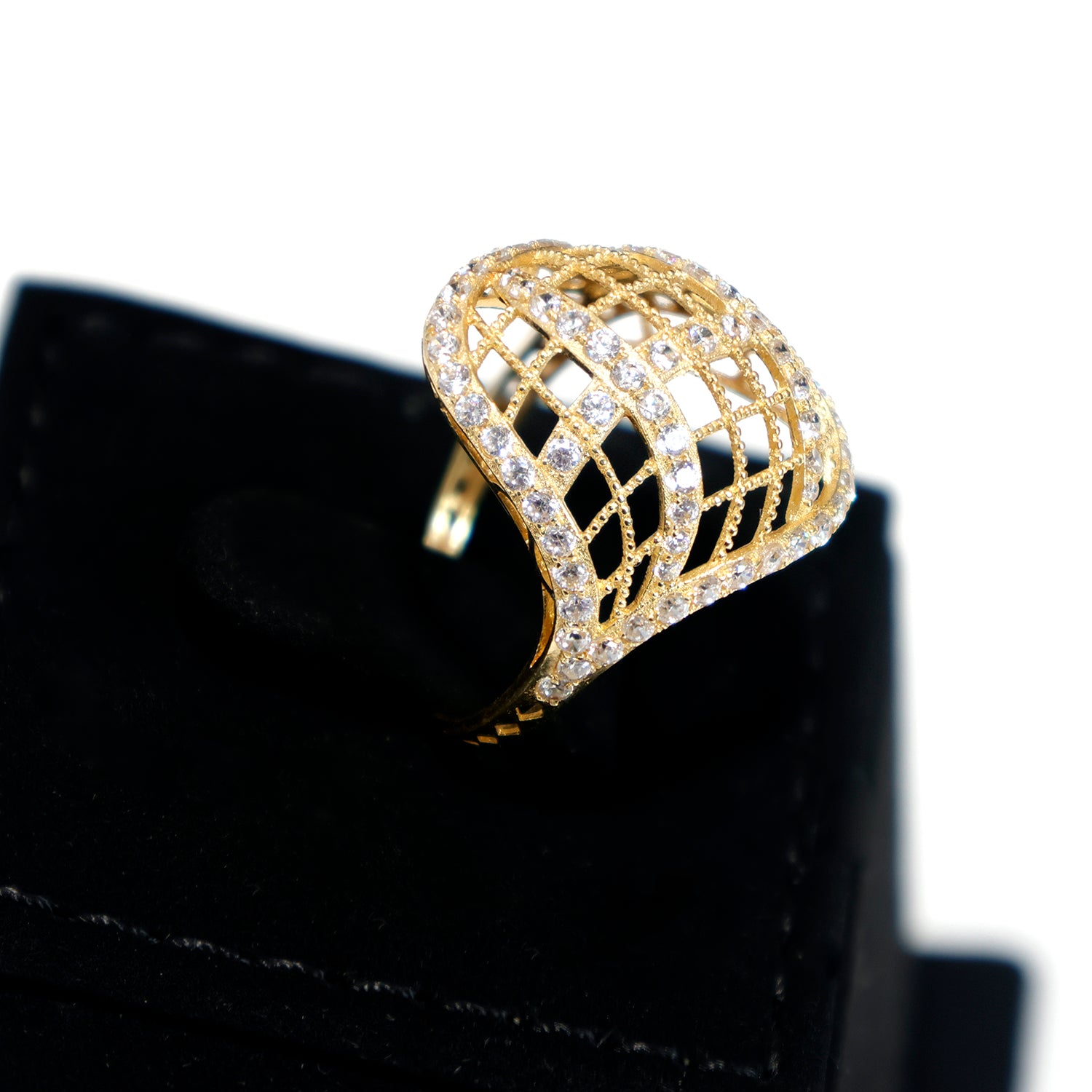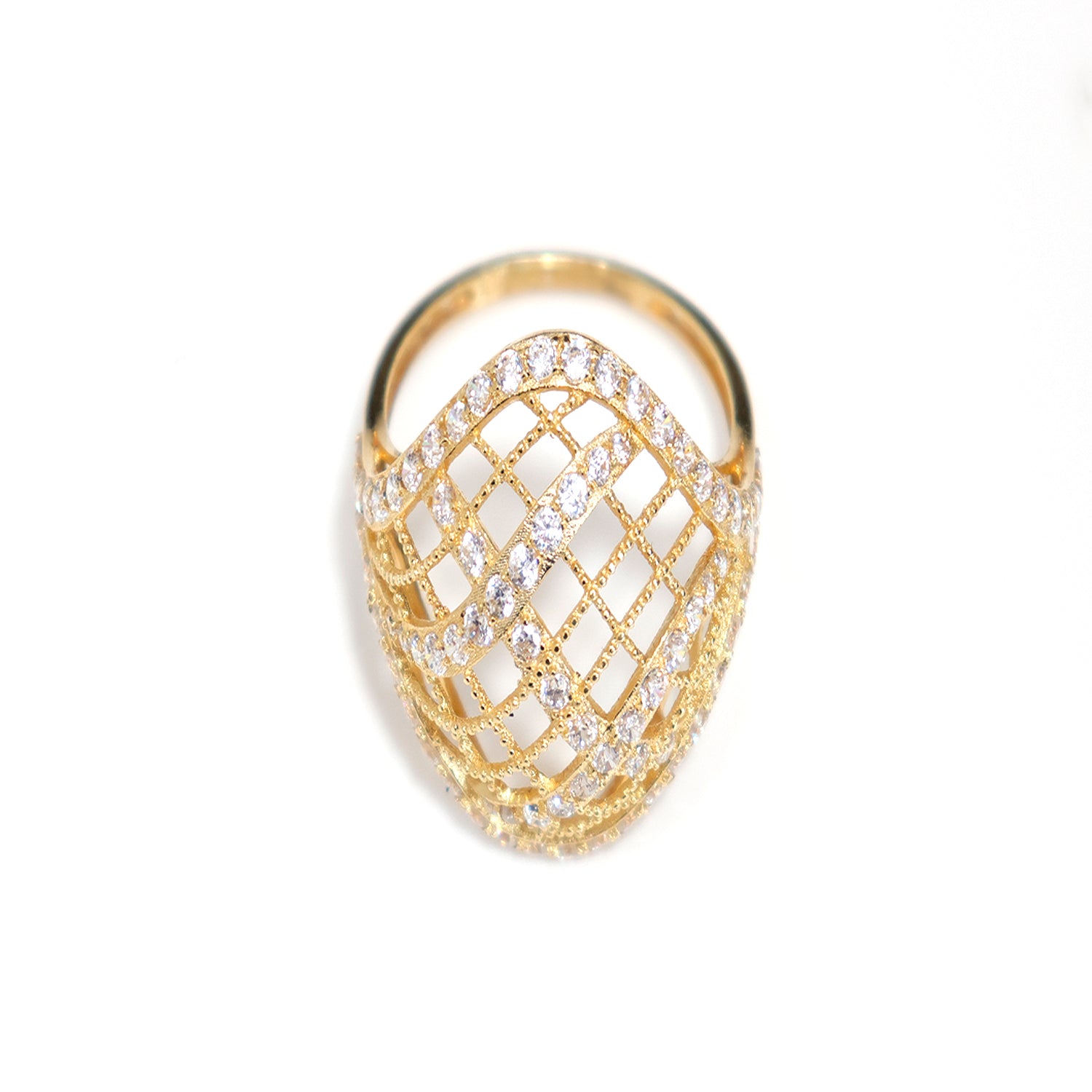 An elegant 18K gold ring featuring an open lattice mesh design highlighted with sparkling CZ stones. Lightweight, stylish and perfect for statement wear.