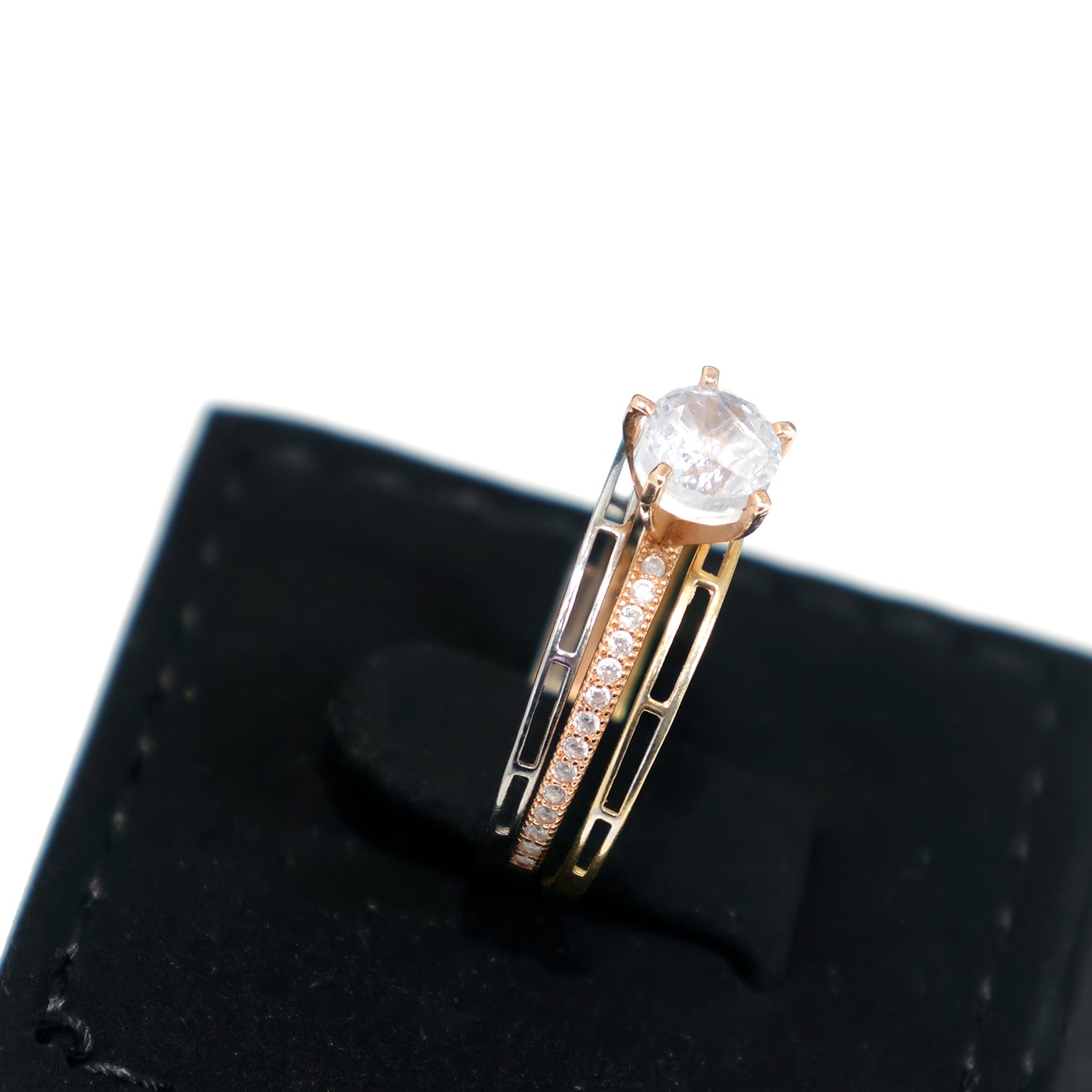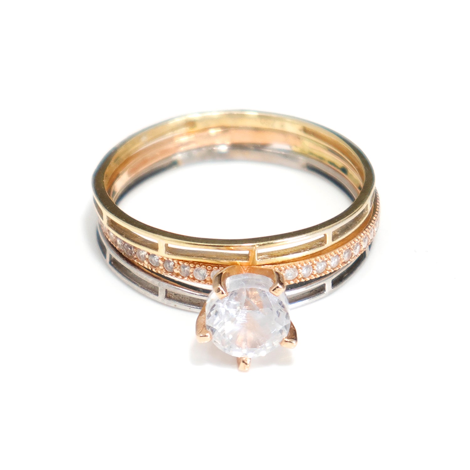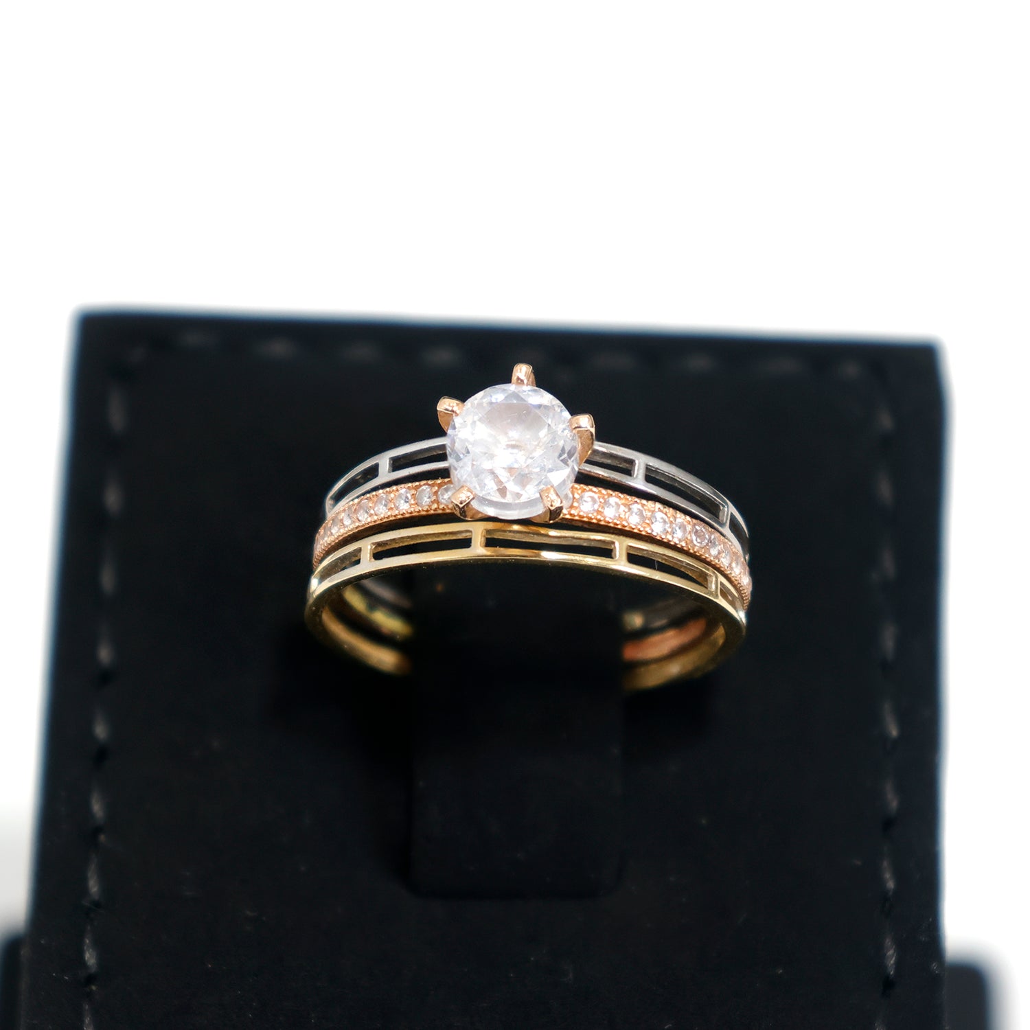 18K Gold Tri-layer CZ Solitaire Ring with Accent Stones – Zero Making Charge