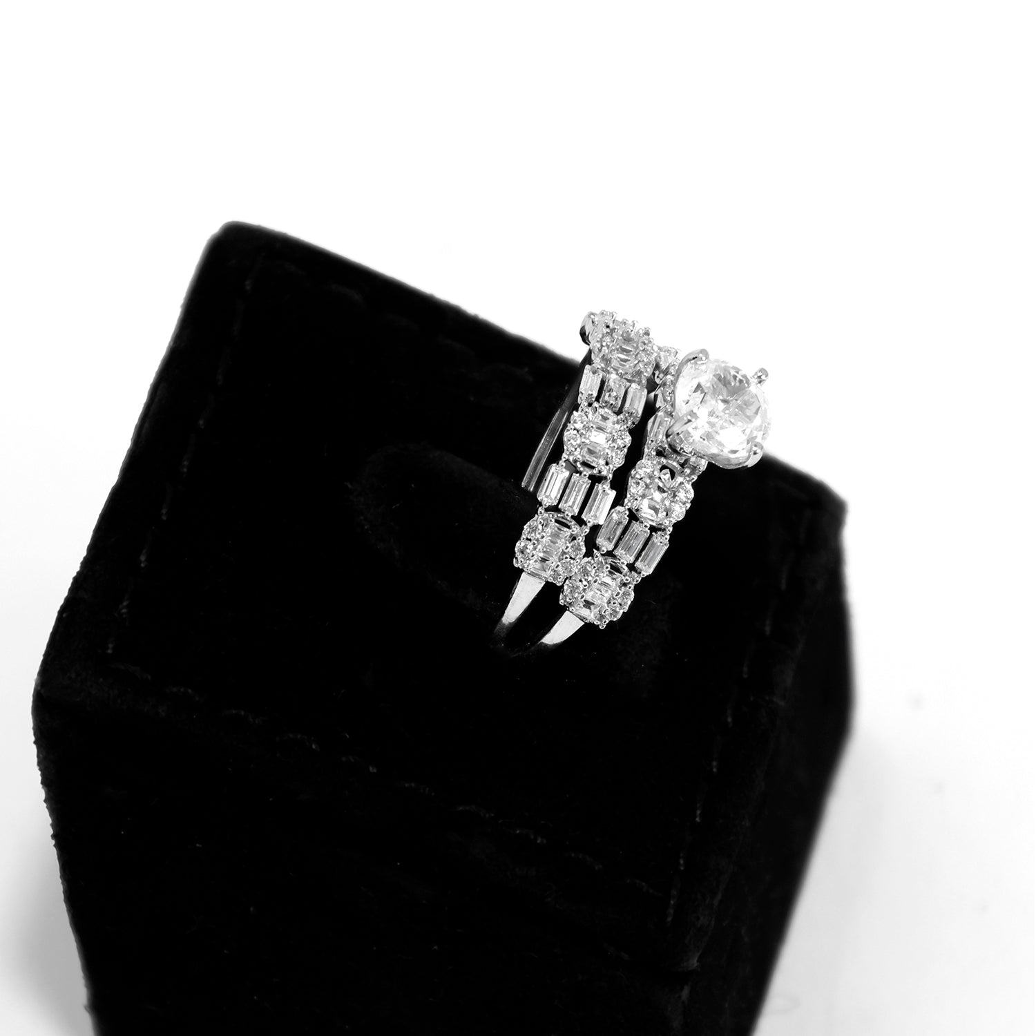 This luxurious 18K white gold ring featuring a sparkling center stone with baguette and round stone detailing. Perfect for gifting or special occasions.