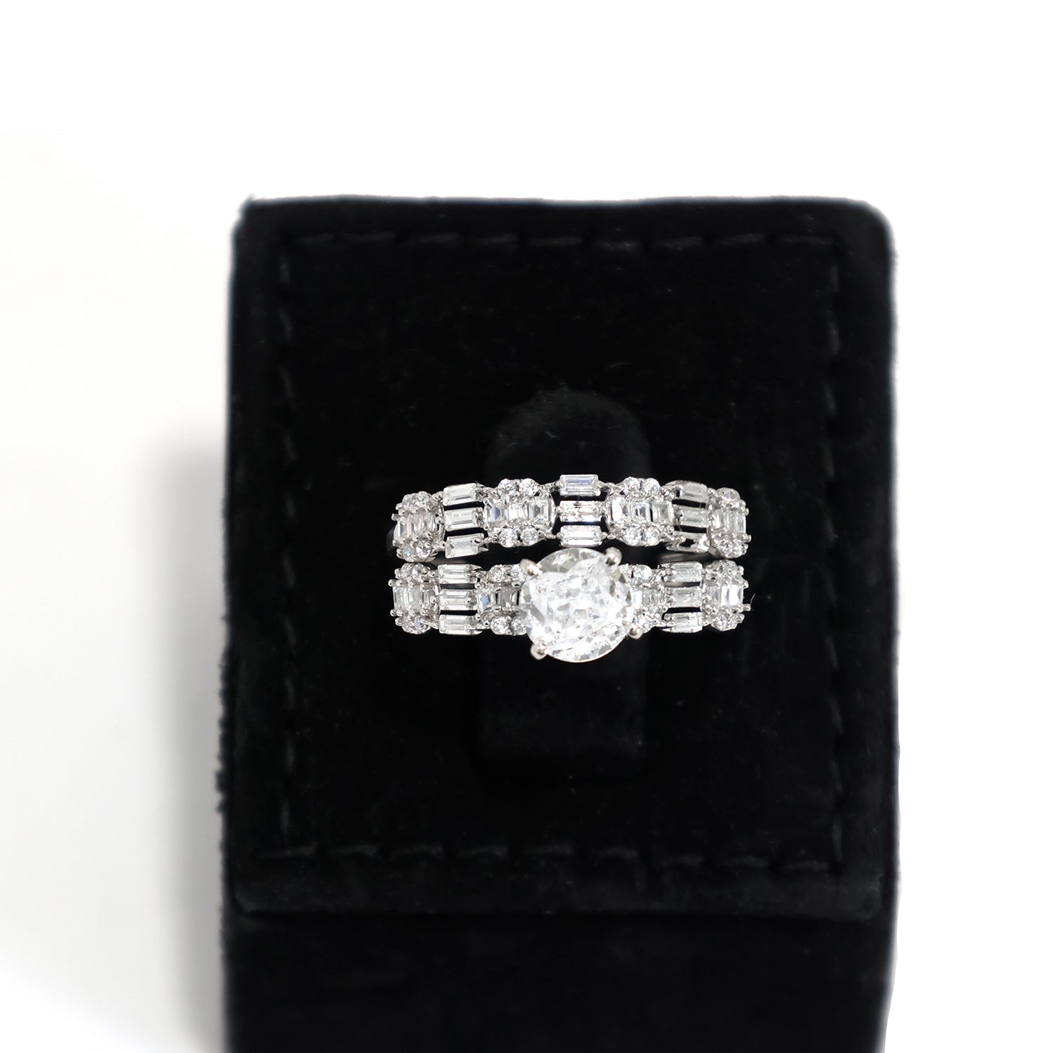18K White Gold Ring with Baguette & Round Stones – Close View