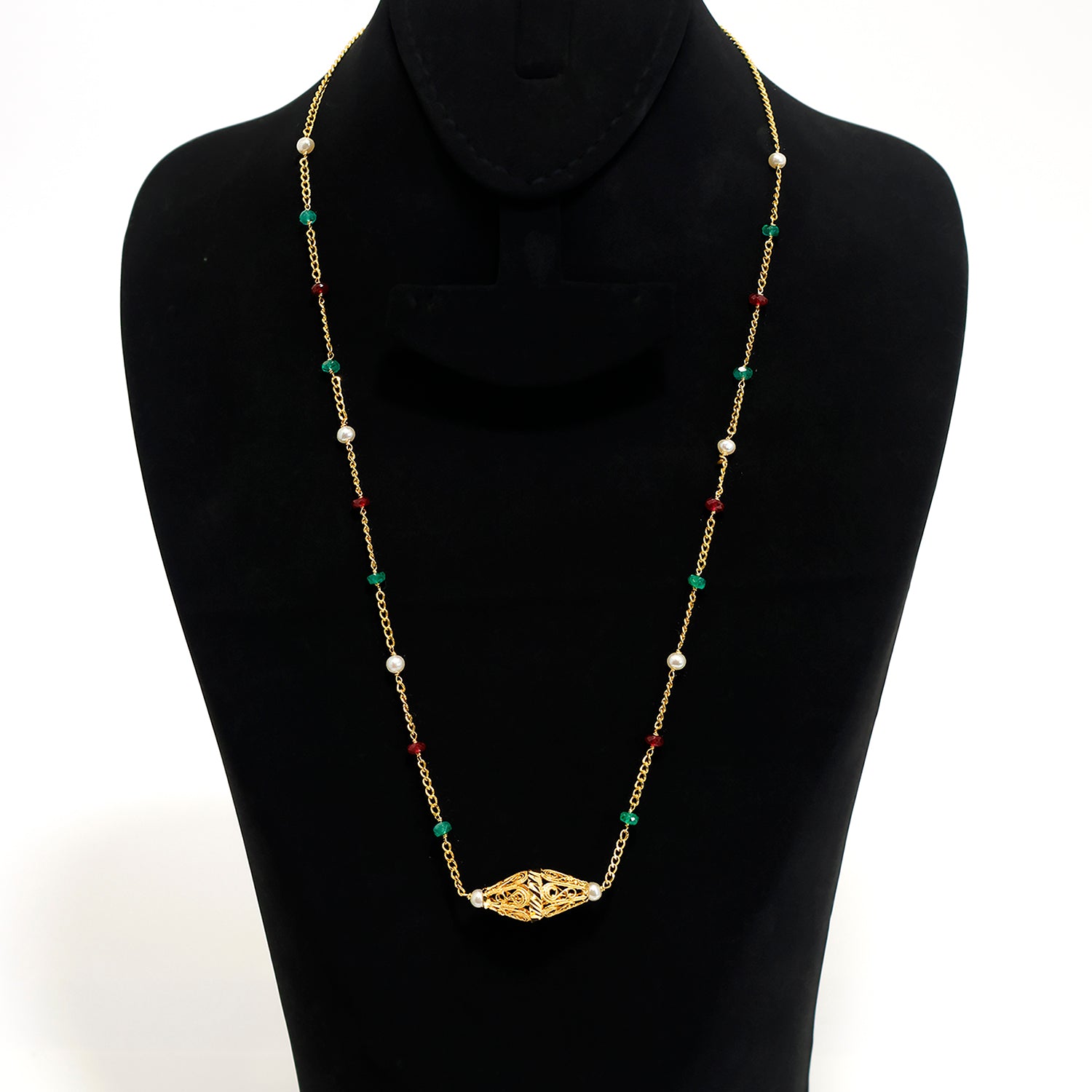 AFN0368421K Gold Necklace – Pearl & Red-Green Bead Station Chain – Zero Making Charge