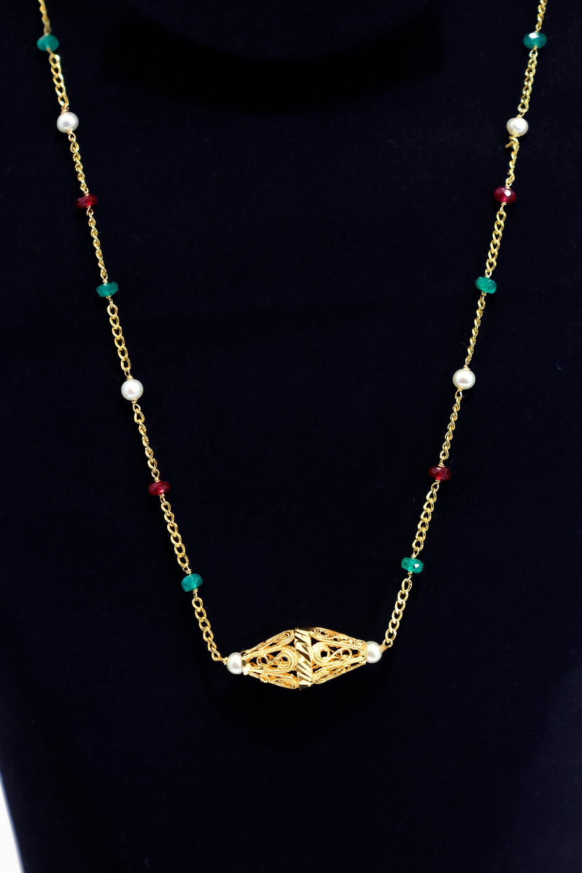 Crafted in 21K gold, this necklace highlights delicate pearl stations with alternating red and green bead accents. Designed for a polished, premium look with everyday comfort.