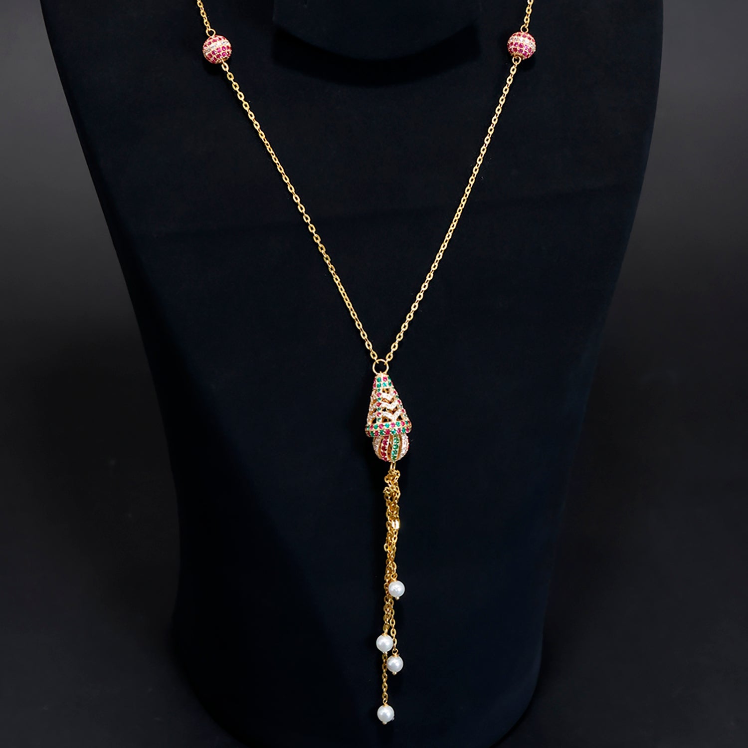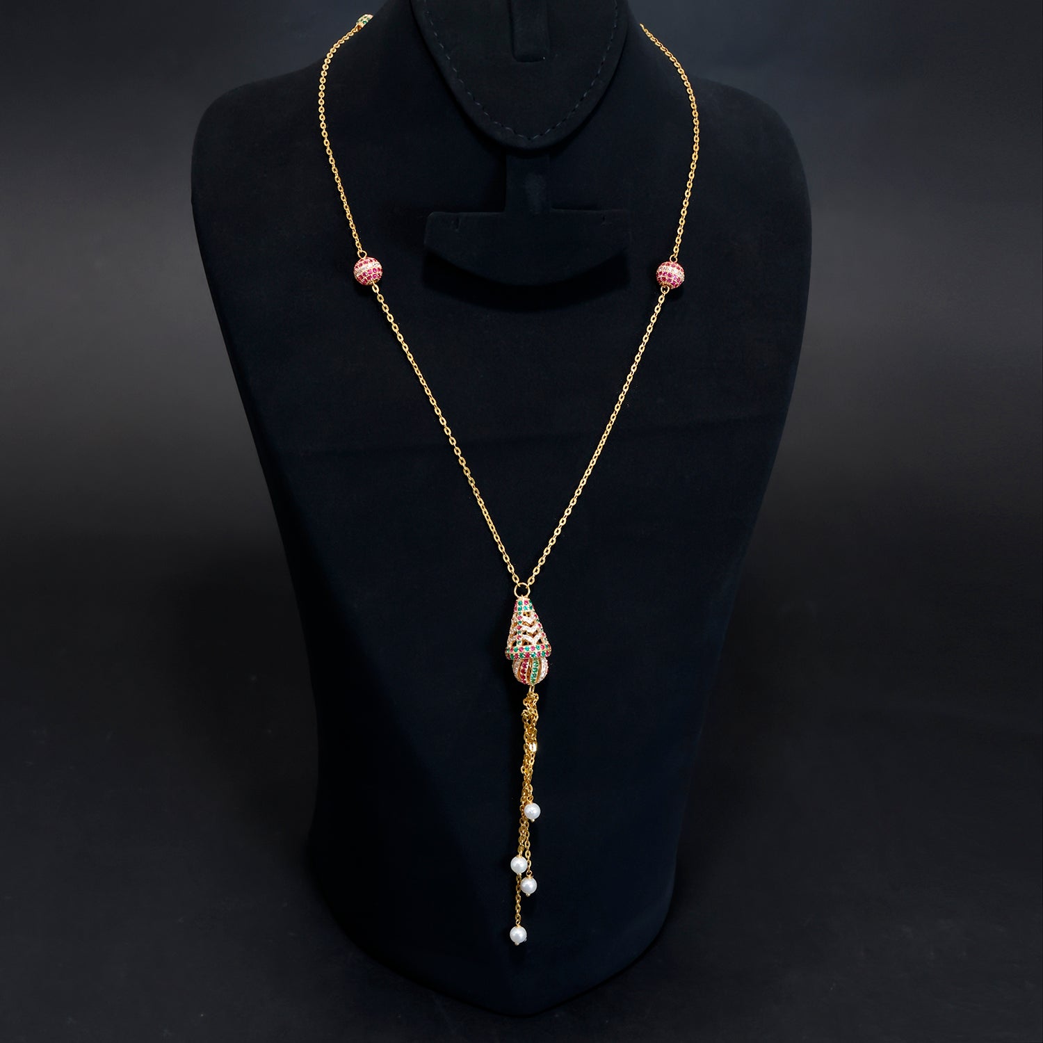 21K Gold Long Necklace with Colourful Pendant and Pearl Drop Detailing - Zero Making Charge