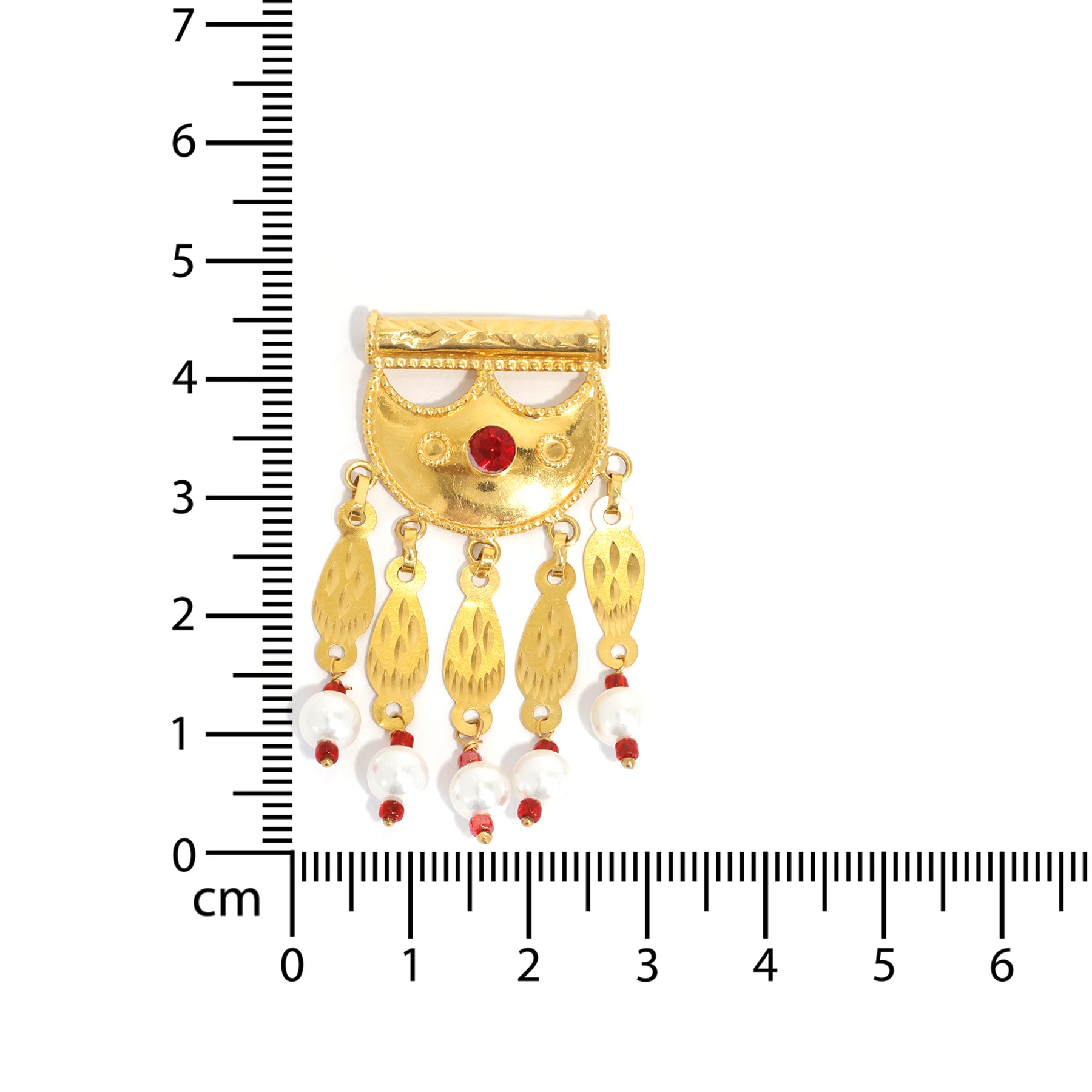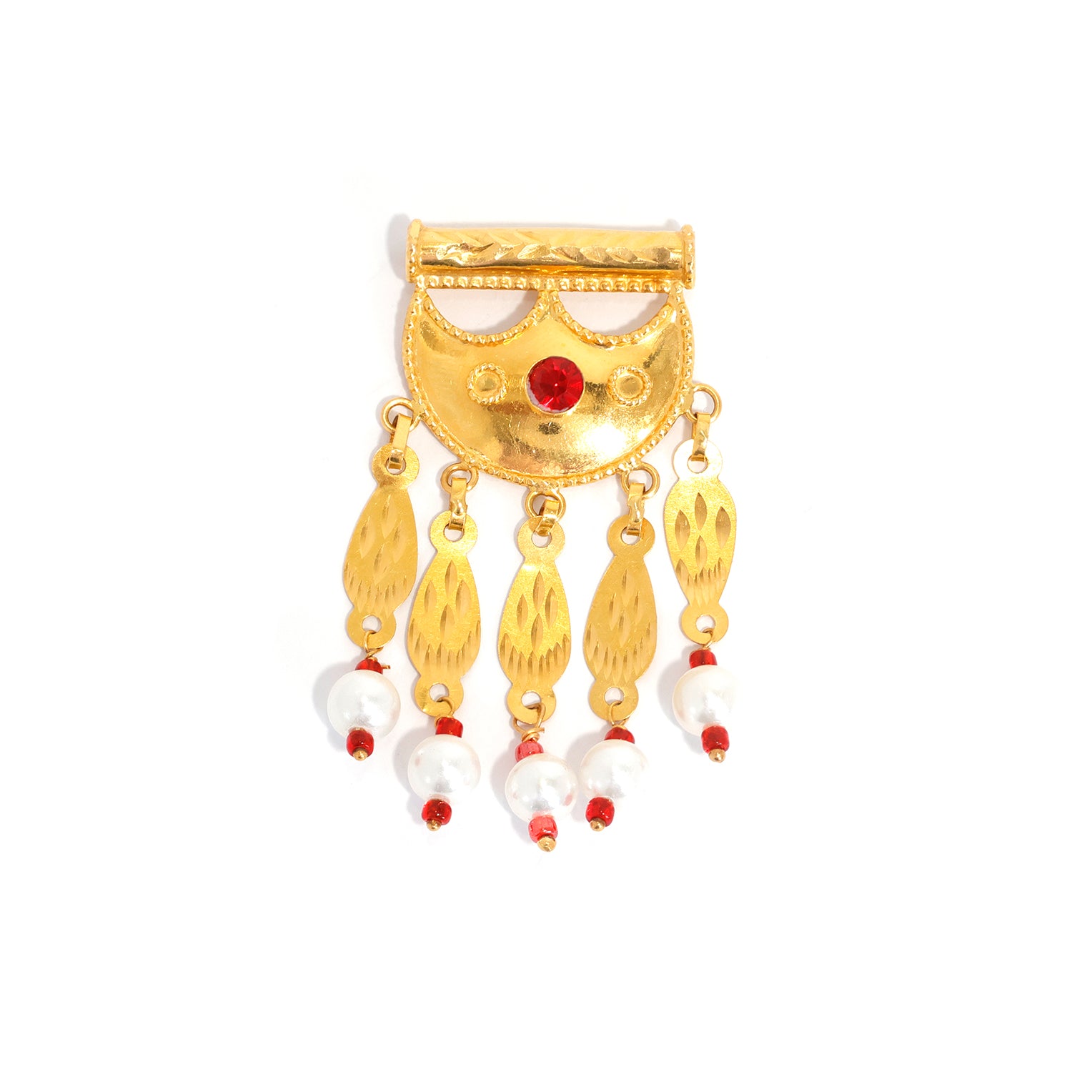 Elevate your jewelry collection with this 21K gold pendants featuring half-moon pendant with red center stone and pearl drops, designed to add a distinctive statement to your everyday style.