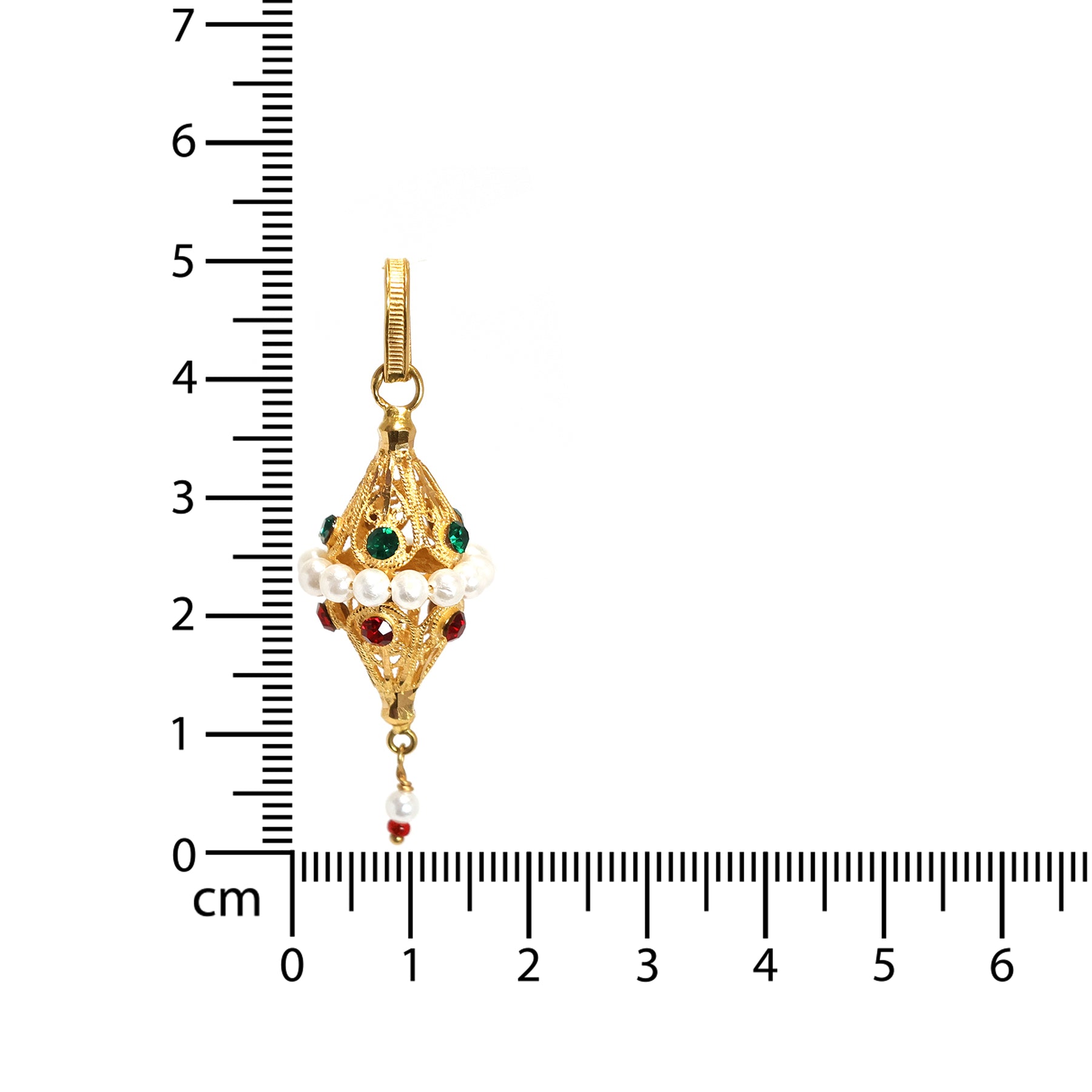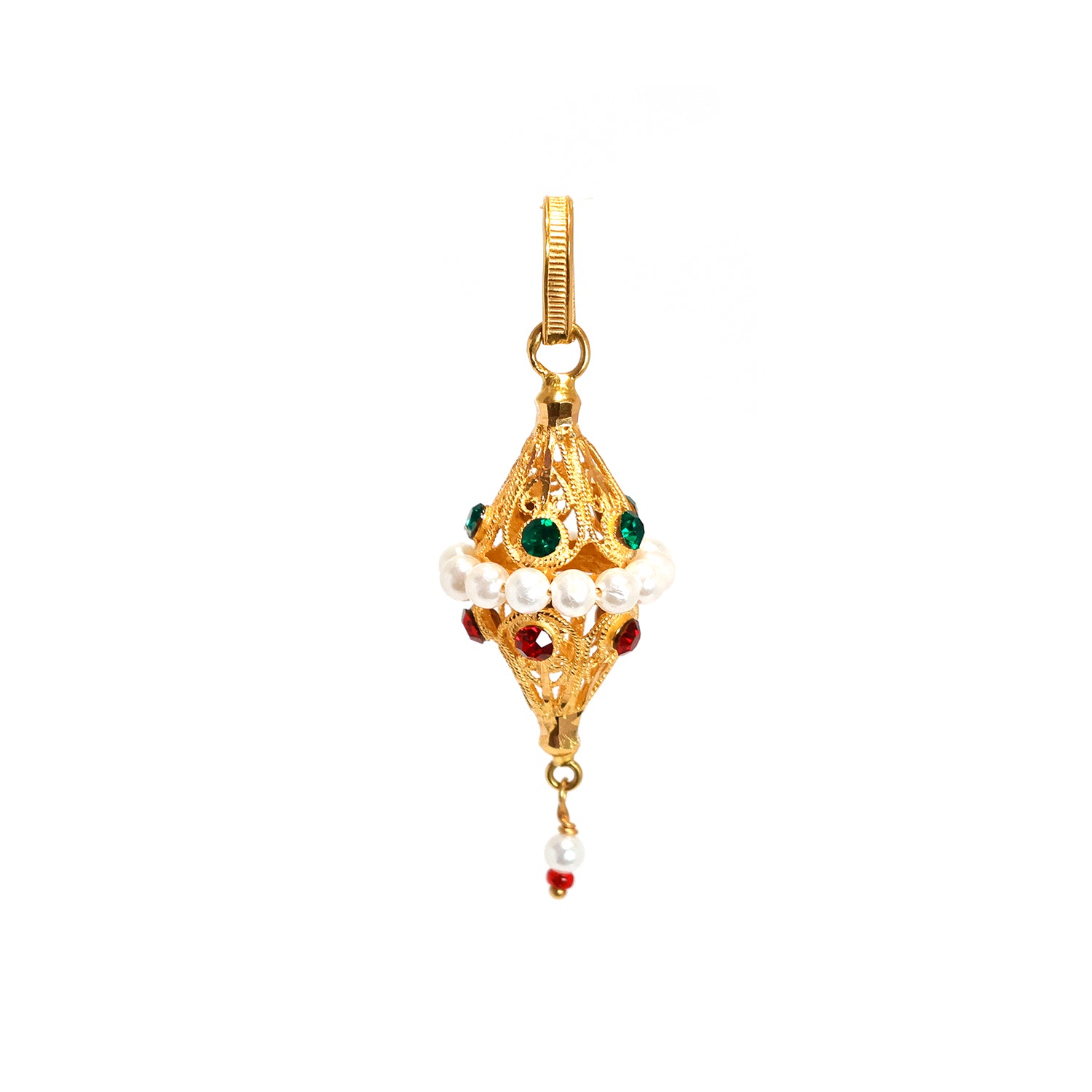 Elevate your jewelry collection with this 21K gold pendants featuring lantern-style filigree pendant with pearl band and stone details, designed to add a distinctive statement to your everyday style.