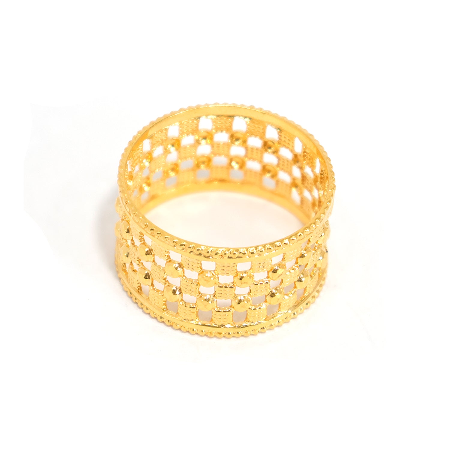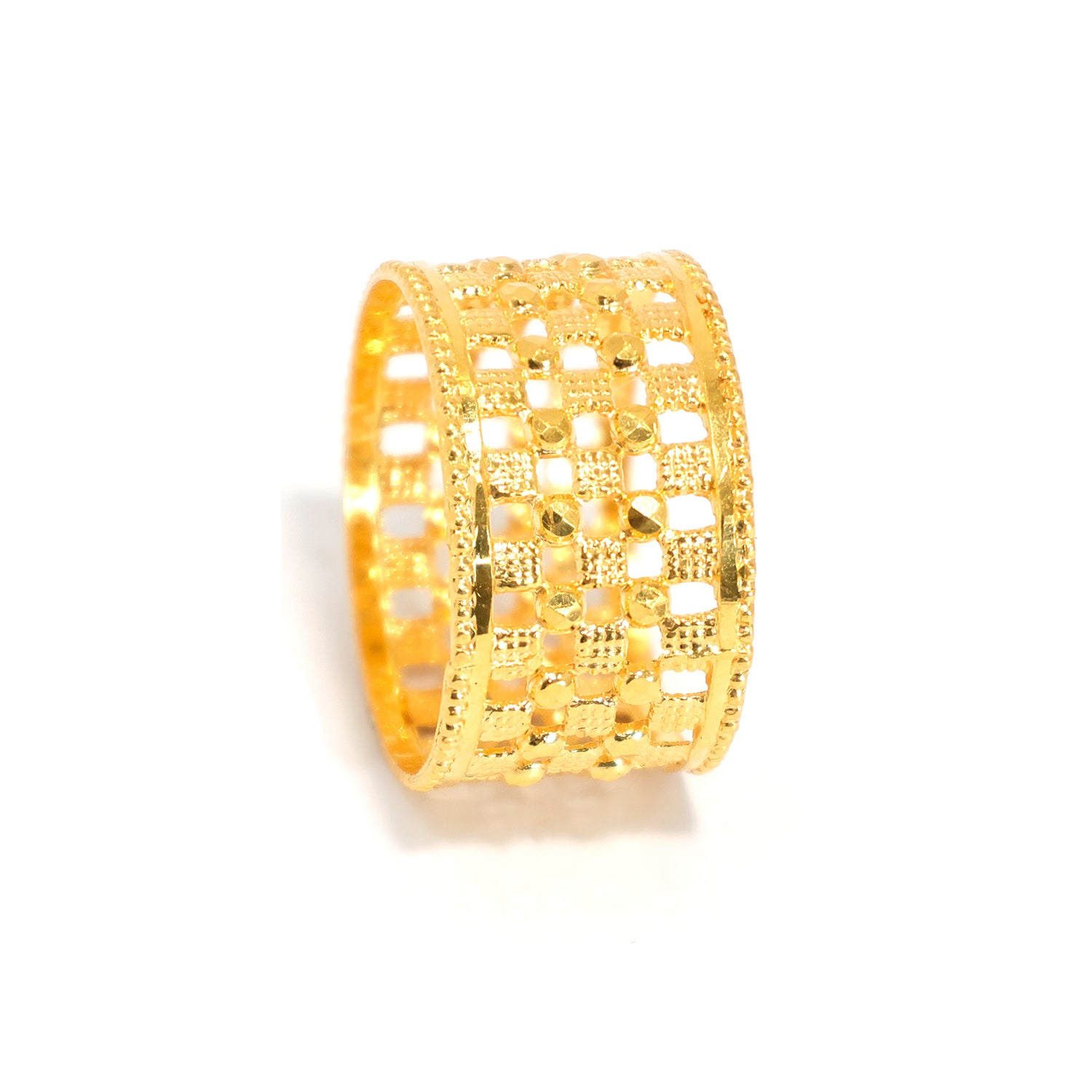 Discover a bold 21K gold wide band ring crafted with an elegant open jali lattice pattern and polished bead detailing. A striking traditional gold ring for statement everyday or festive wear.