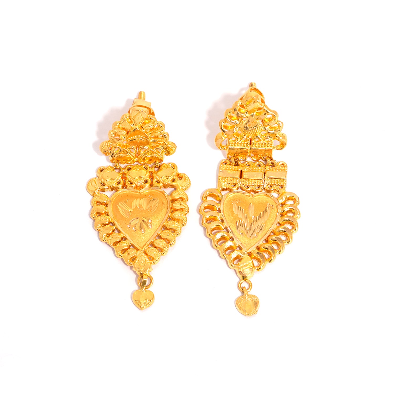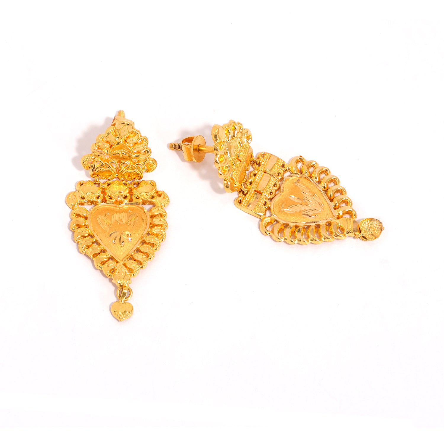 Crafted in luminous 22K yellow gold, these earrings feature a ornate heart drop with mini charm for a graceful, polished look. Finished with a screw style fastening, they offer an elegant profile that suits both daily wear and special occasions. Lightweight yet substantial at approximately 4.83g, they bring refined shine without feeling heavy.