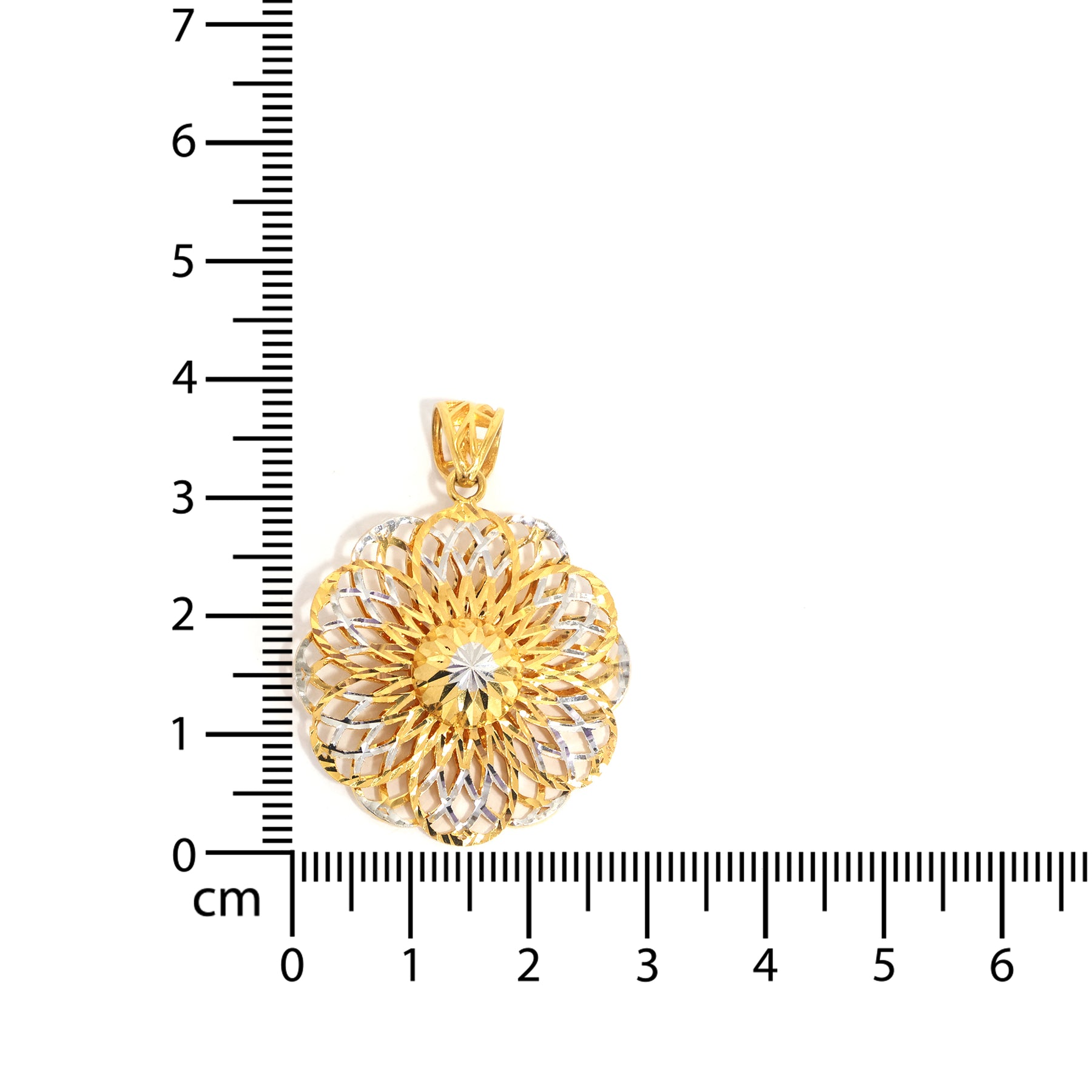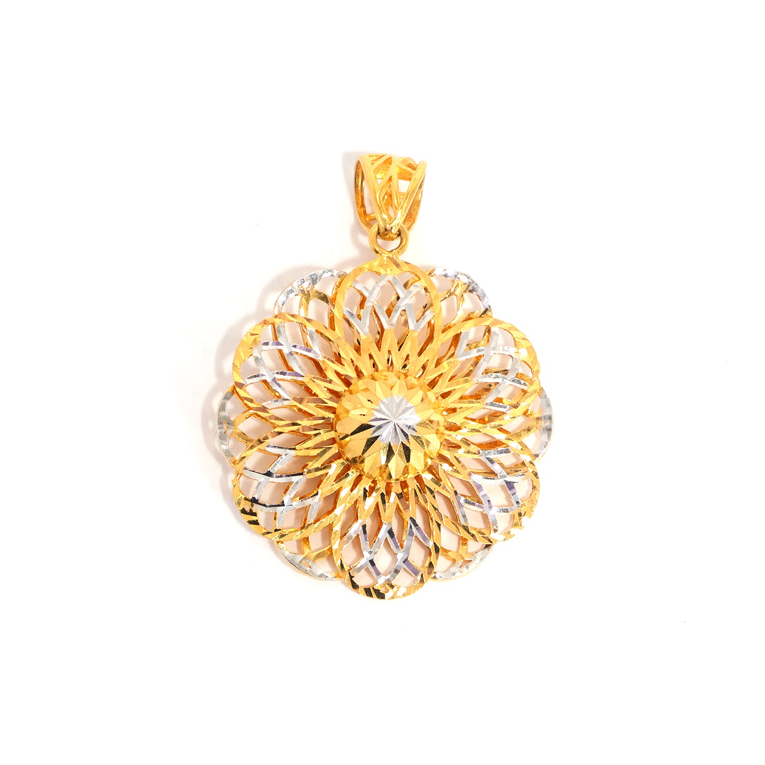 Elevate your jewelry collection with this 22K gold pendants featuring layered floral pendant with two-tone diamond-cut petals, designed to add a distinctive statement to your everyday style.