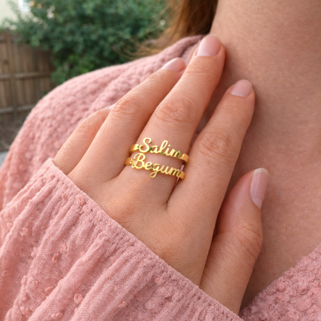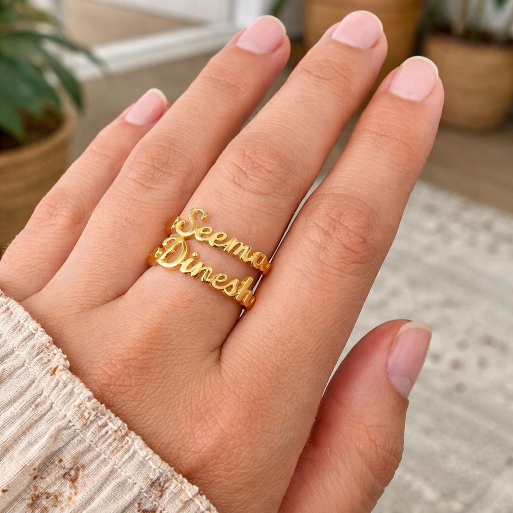 The design is made to keep both names readable while maintaining a clean, premium look. The ring sits comfortably on the finger with smooth finishing for daily wear.