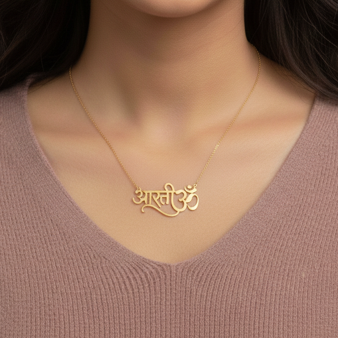 A meaningful 4g custom Hindi name necklace in real 18K gold, beautifully paired with the sacred Om symbol and crafted in-house in Dubai.