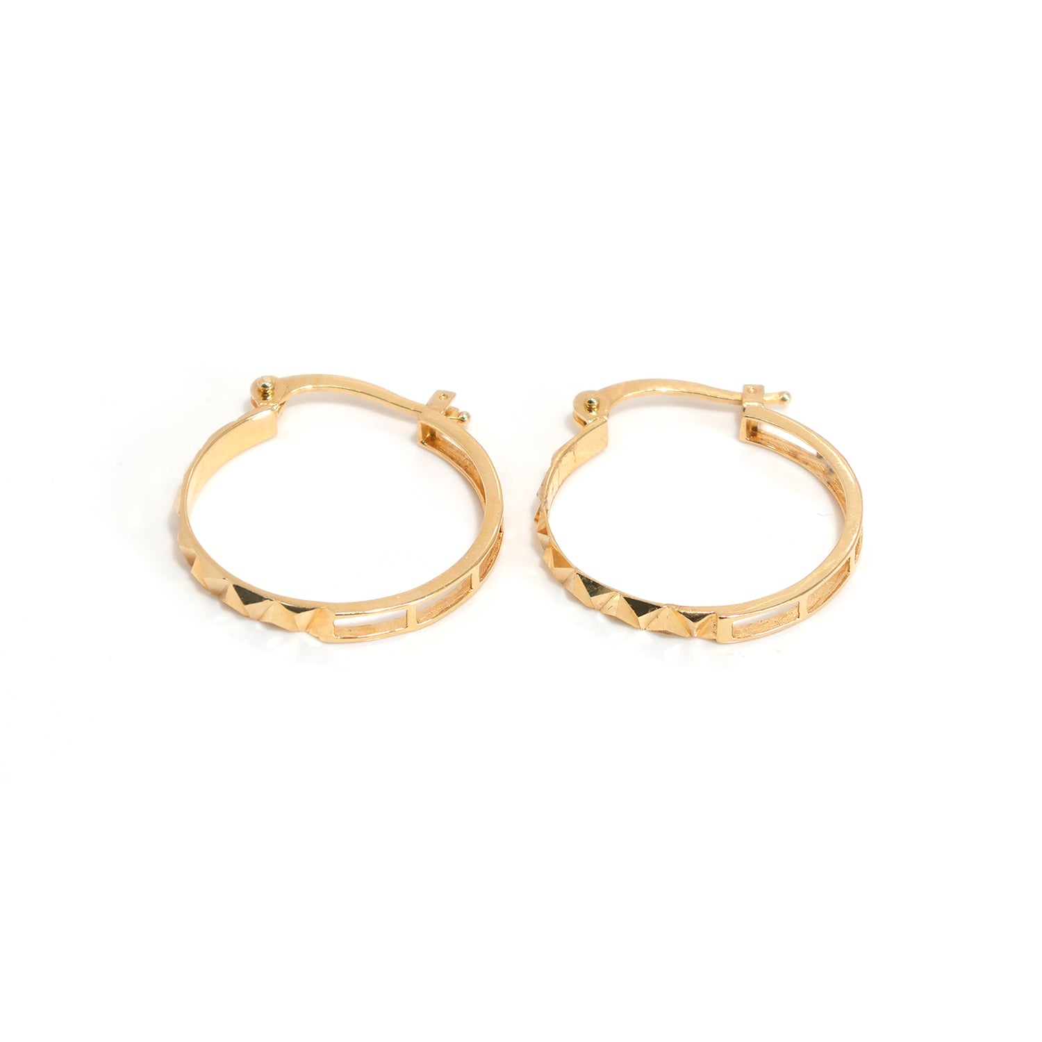18K Gold Earrings – geometric hoop with faceted triangle accents along the band – Buy Now