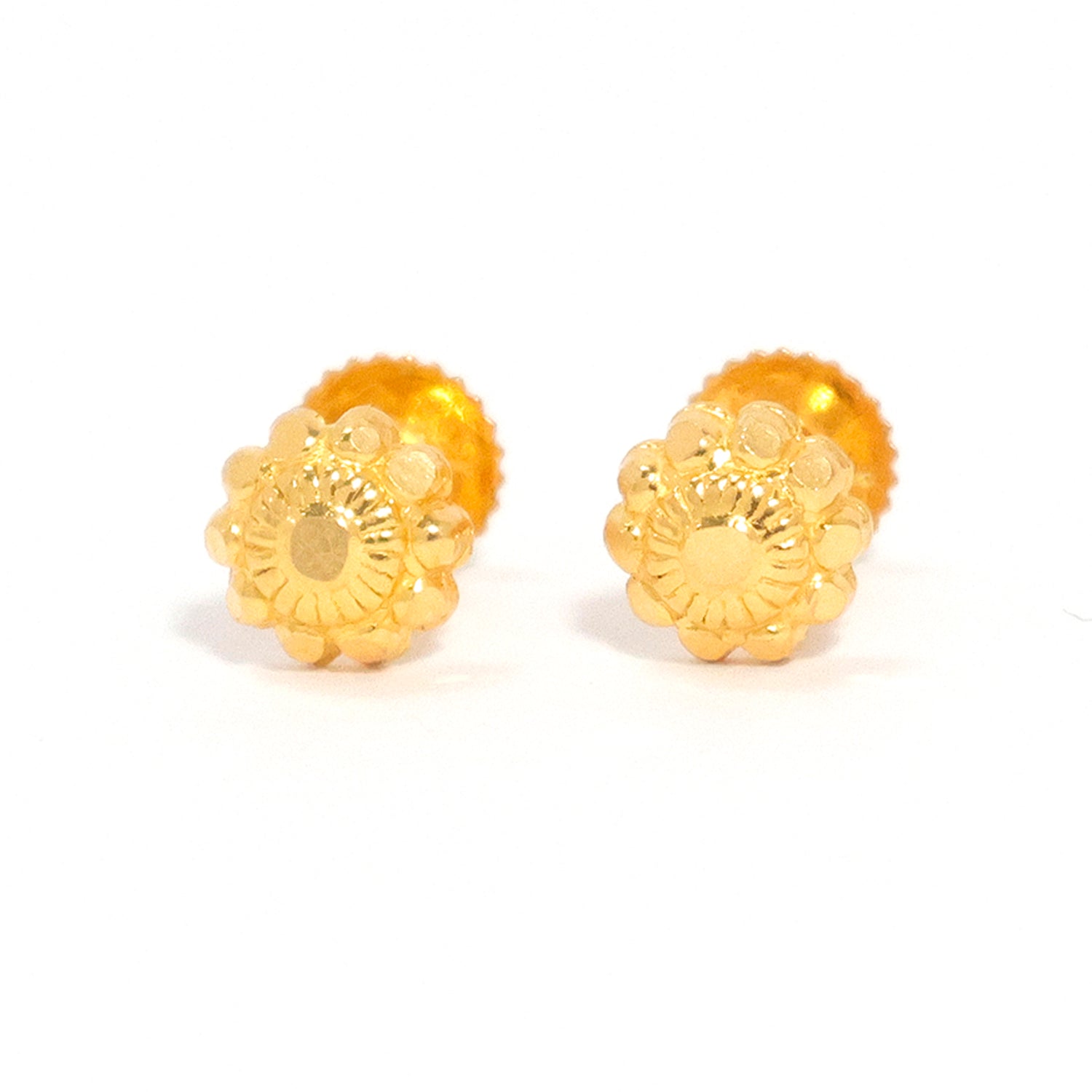 Bring a touch of delicate beauty to your everyday style with these 22K Gold Mini Flower Earrings. Crafted from pure 22K gold, each earring features a tiny floral design with fine detailing that captures the charm of a blooming flower. Lightweight and versatile, they add just the right amount of shine—perfect for daily wear, layering, or gifting.