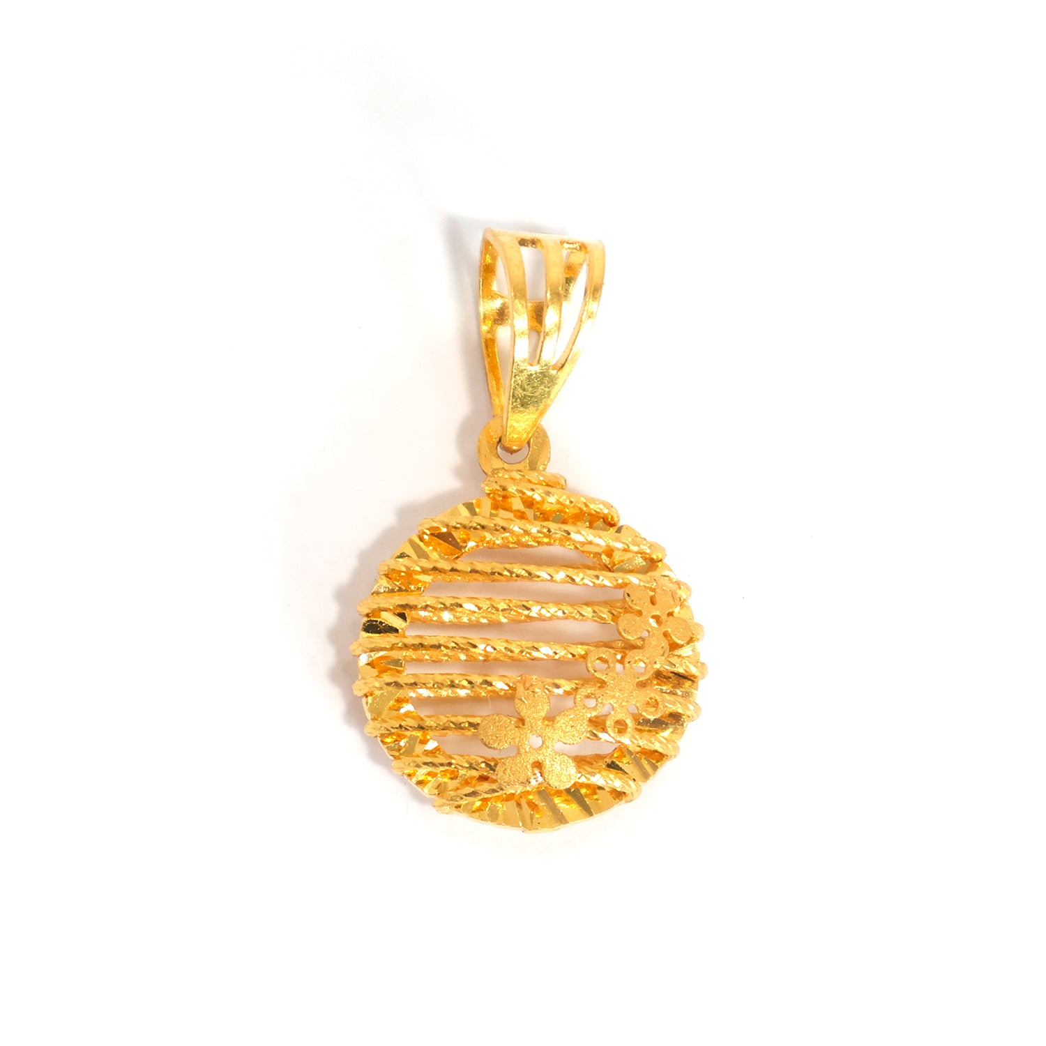 A classic 22K gold pendant with a distinctive presence. Featuring circular pendant accented with fine floral motifs and a diamond-cut rim. Crafted to shine beautifully with minimal effort and maximum elegance.
