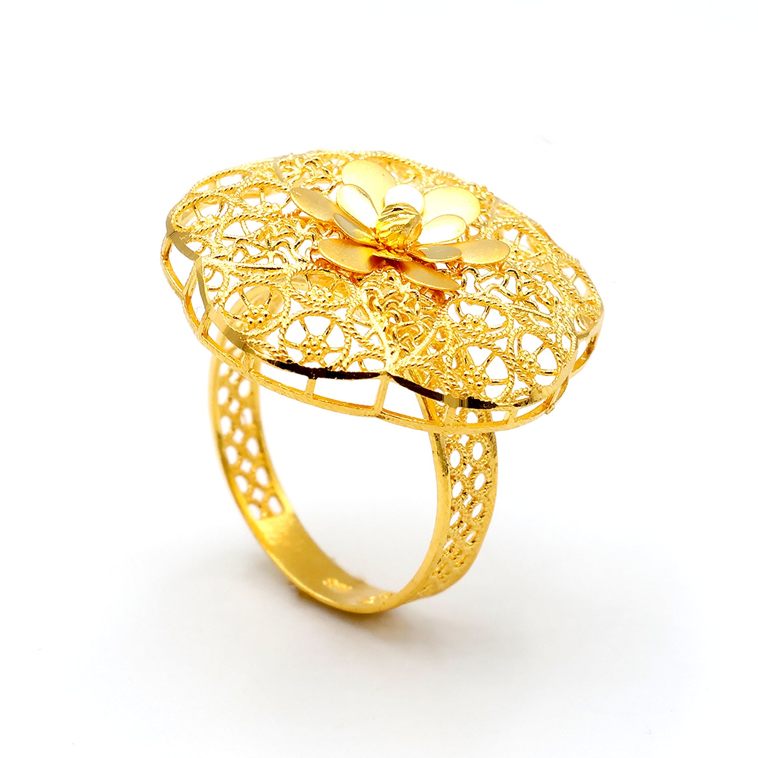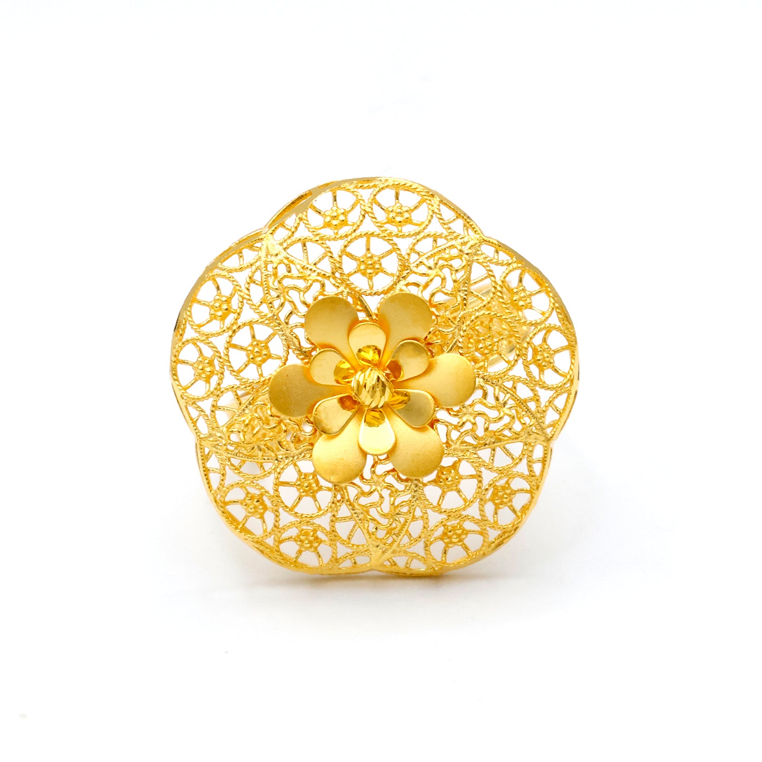 Grace meets grandeur in this exquisite 21K Gold Ring, featuring an ornate filigree flower design that celebrates timeless craftsmanship. Handcrafted from rich 21-karat gold, the ring showcases intricate floral patterns with delicate openwork detailing, each curve and swirl designed to capture light beautifully. Perfect for both everyday elegance and special occasions, this statement piece embodies the essence of traditional artistry with a modern touch.