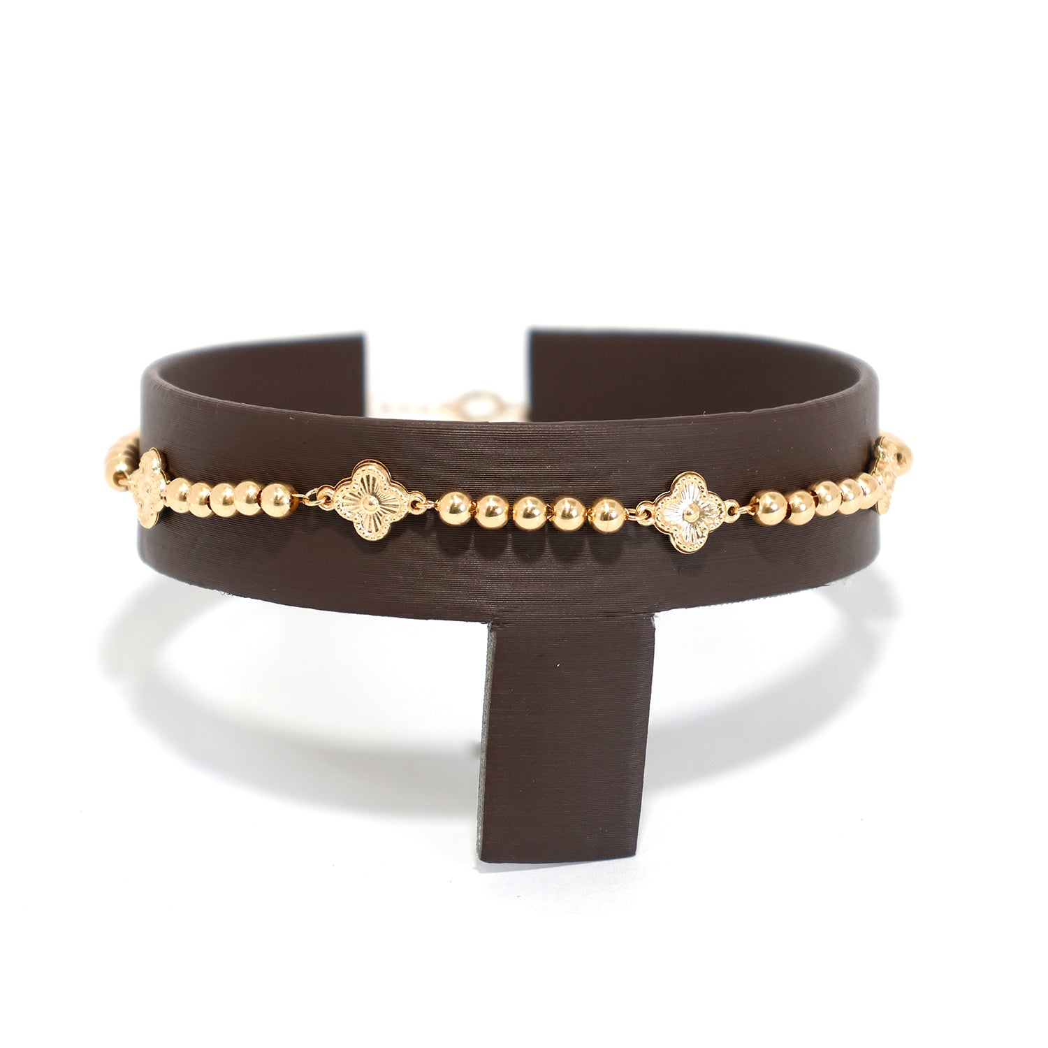 Discover an elegant 18K gold bracelet featuring delicate floral motifs and polished gold beads. Perfect for daily wear or gifting.
