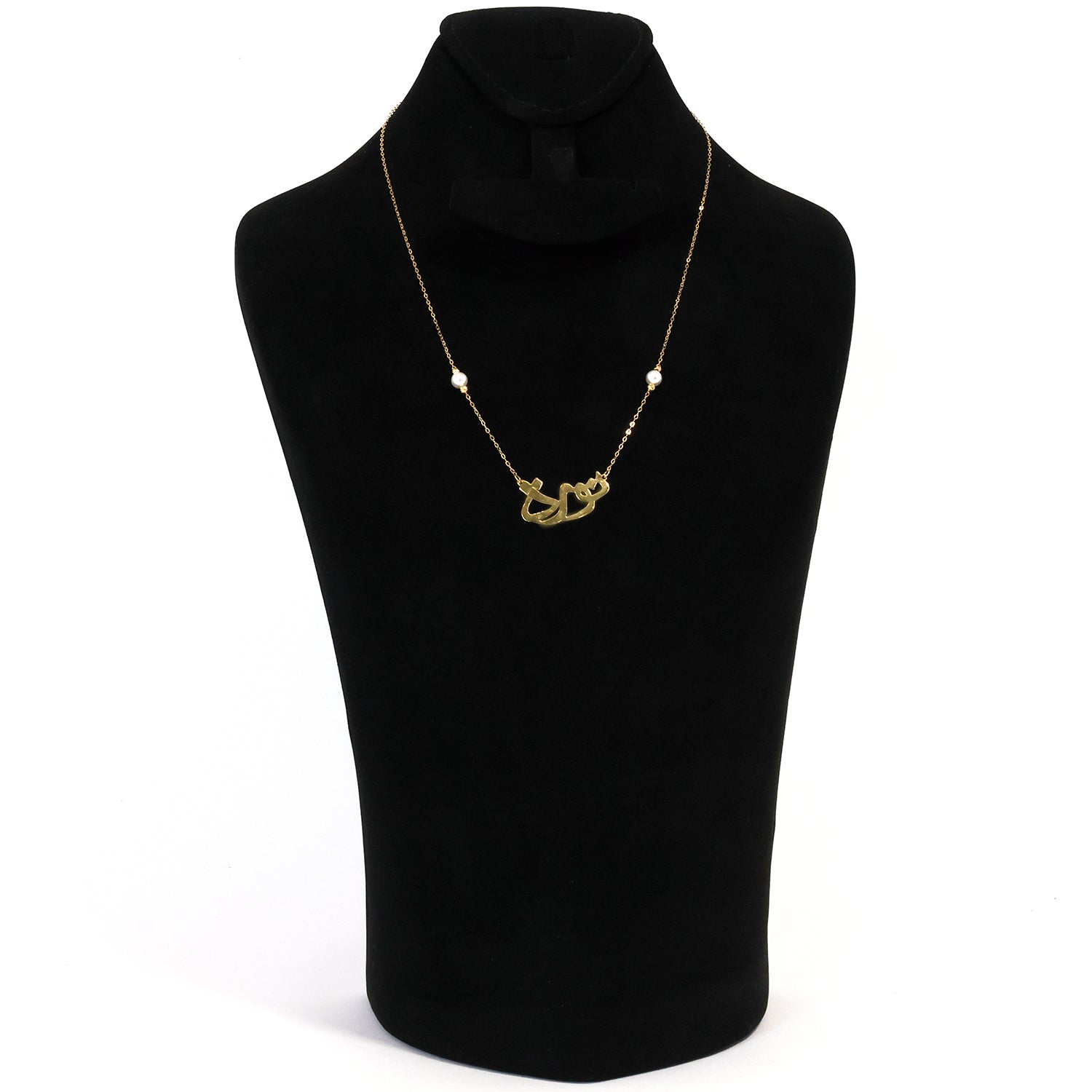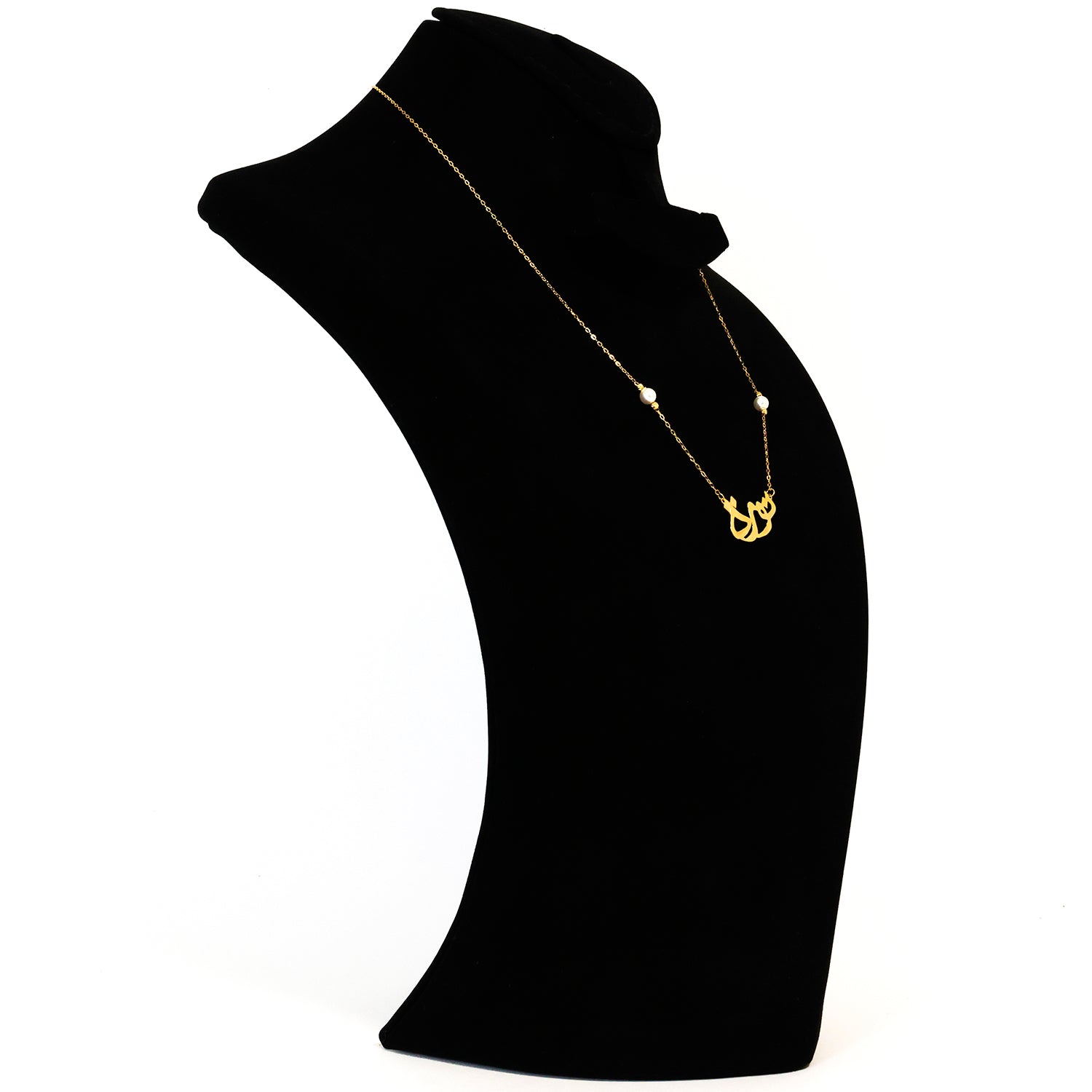 Black mannequin bust with a gold necklace and pearl pendant on a white background
