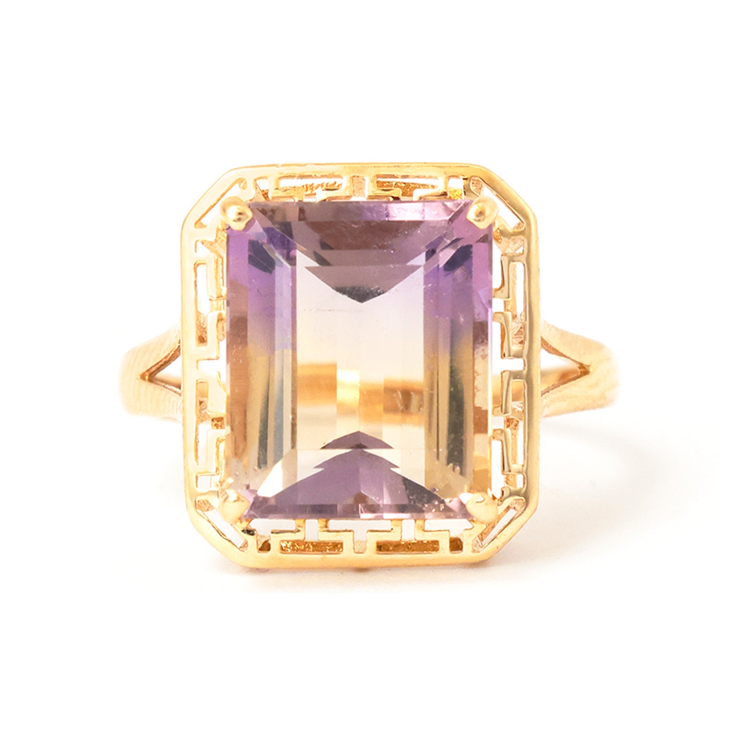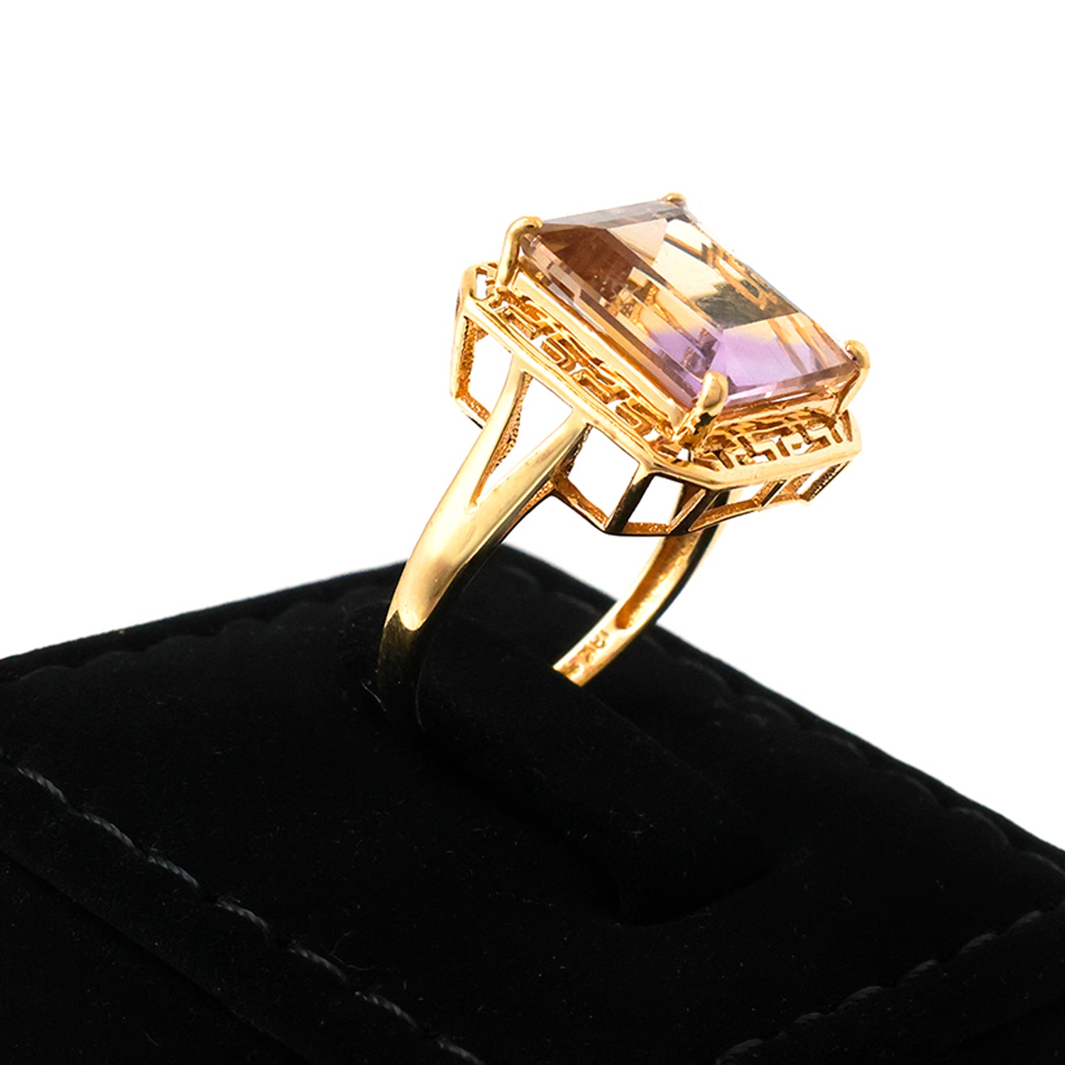 Gold ring with a rectangular purple gemstone on a white background