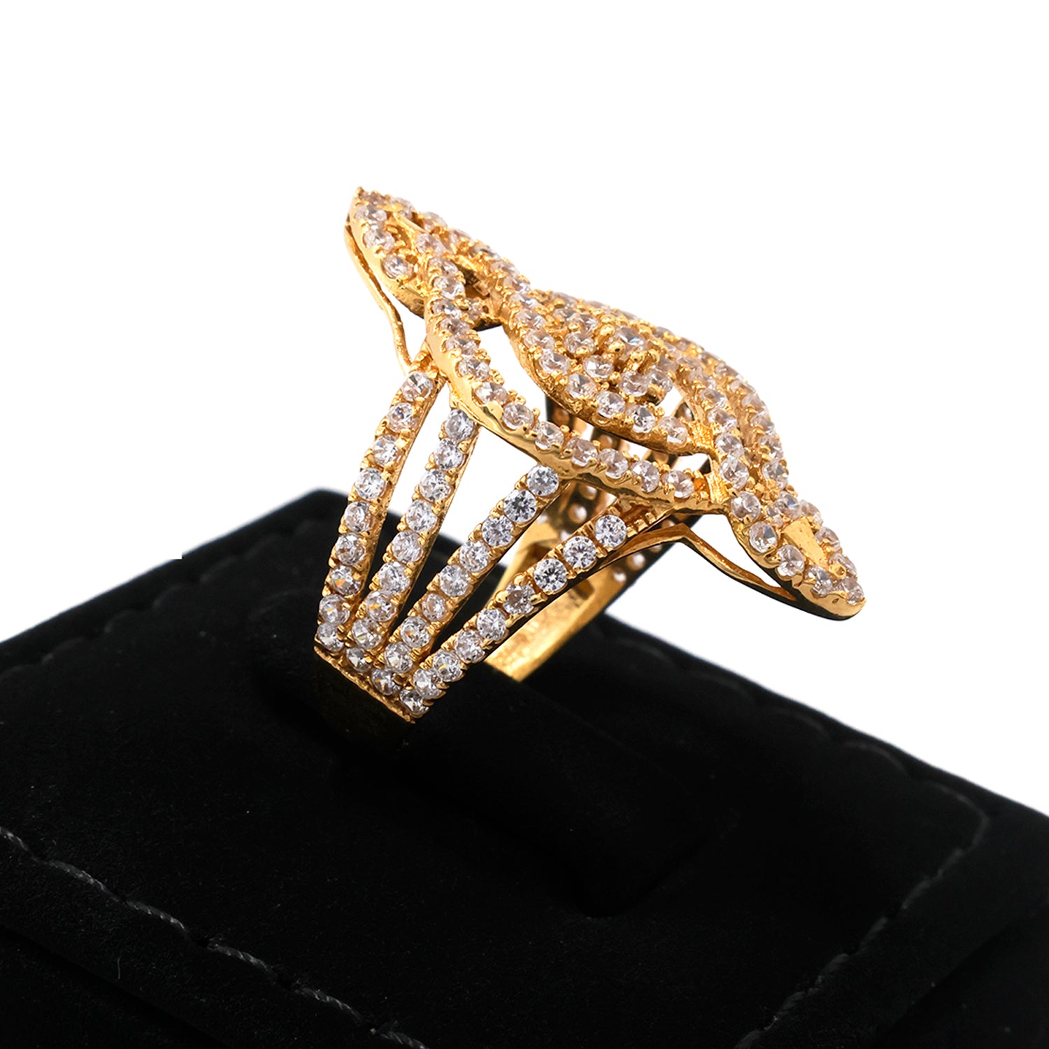 A statement 18K yellow gold ring crafted with a marquise-inspired openwork frame and shimmering pavé lines for a luxurious look.
