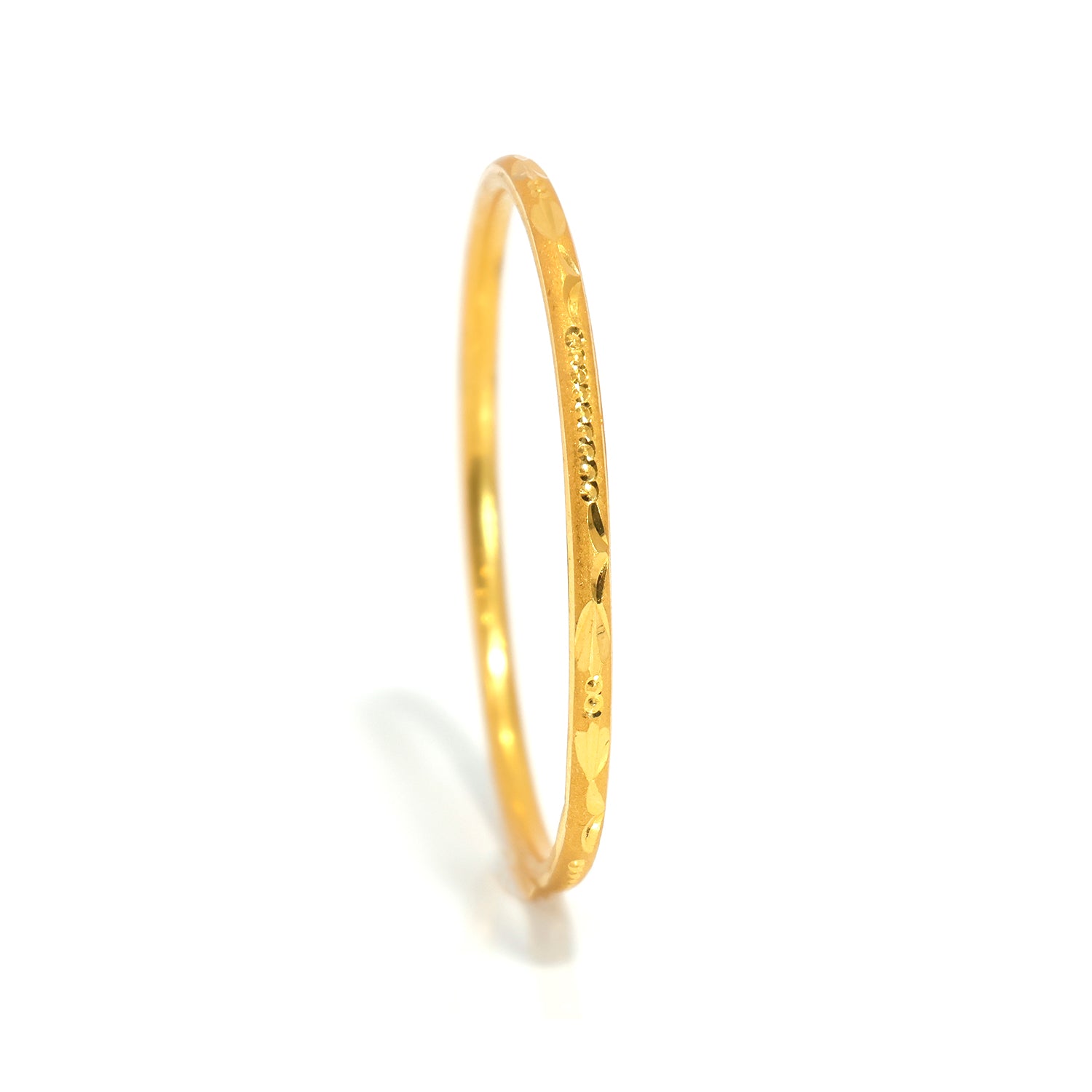 A timeless classic crafted in radiant 21-karat gold, this thin bangle offers effortless elegance for everyday wear. The sleek, minimal profile makes it a versatile accessory, perfect for layering or wearing solo as a subtle statement of luxury.ย Designed with comfort in mind, the smooth finish and lightweight feel allow easy all-day wear, while the purity of 21K gold ensures lasting value and brilliance.