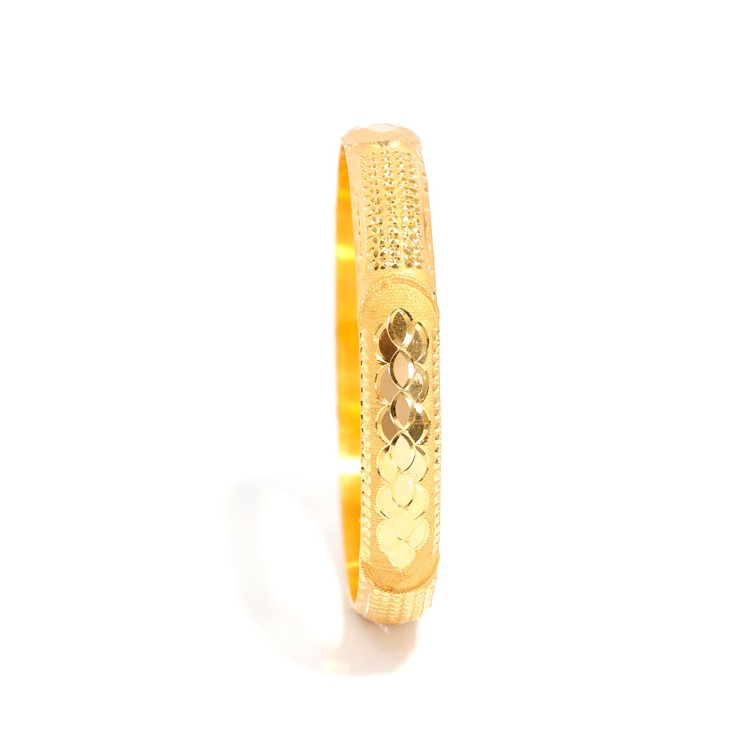 Crafted in pure 21K gold, this charming bangle combines a shimmering diamond-cut texture with an elegant floral motif for a radiant finish. Each carved surface catches the light beautifully, creating a soft sparkle that enhances the natural glow of the gold.ย Designed for timeless appeal and daily comfort, the smooth interior and lightweight profile make it ideal as a single statement or stacked with other bangles.