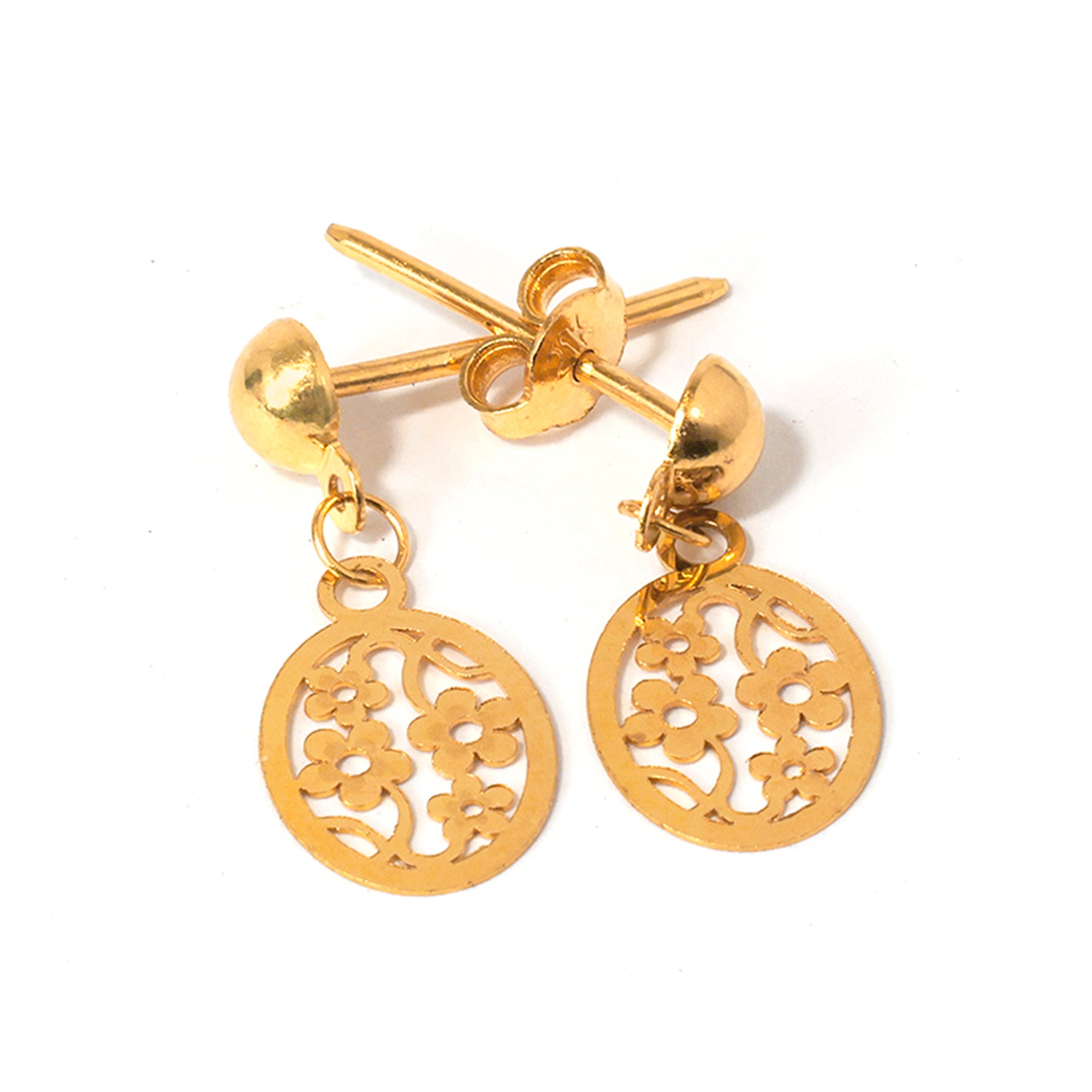 Elevate your everyday style with 21K gold earrings featuring an oval openwork disc with small flower cut-outs. A refined choice with Zero Making Charge.
