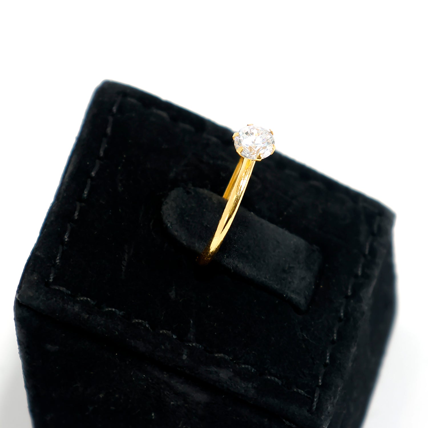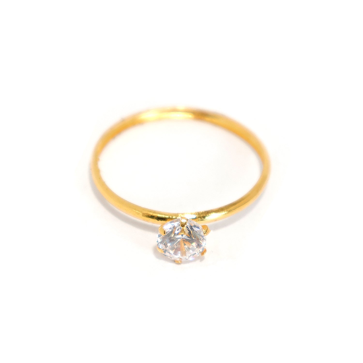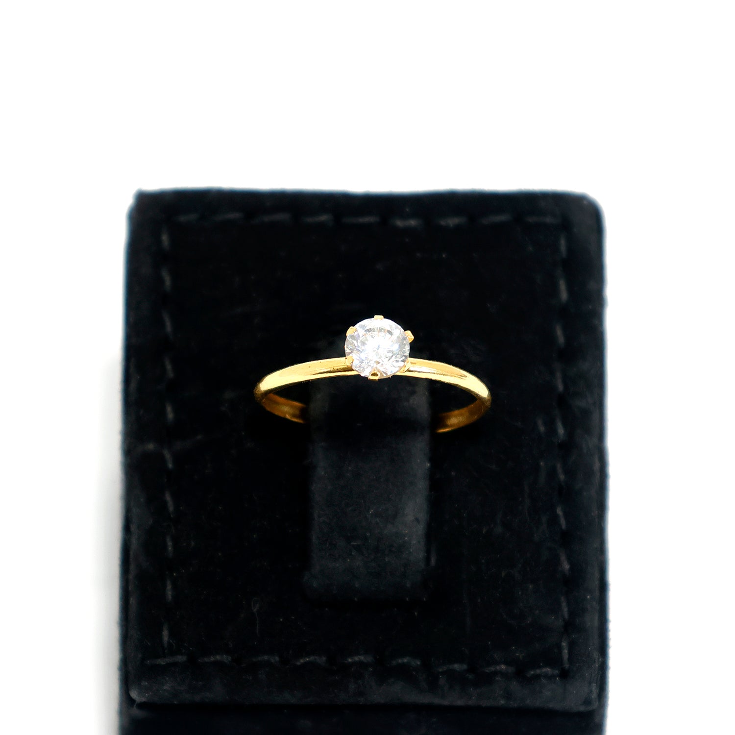 Elegant 21K gold solitaire ring featuring a single clear stone on a sleek band. A timeless, minimal design perfect for daily wear or special occasions.