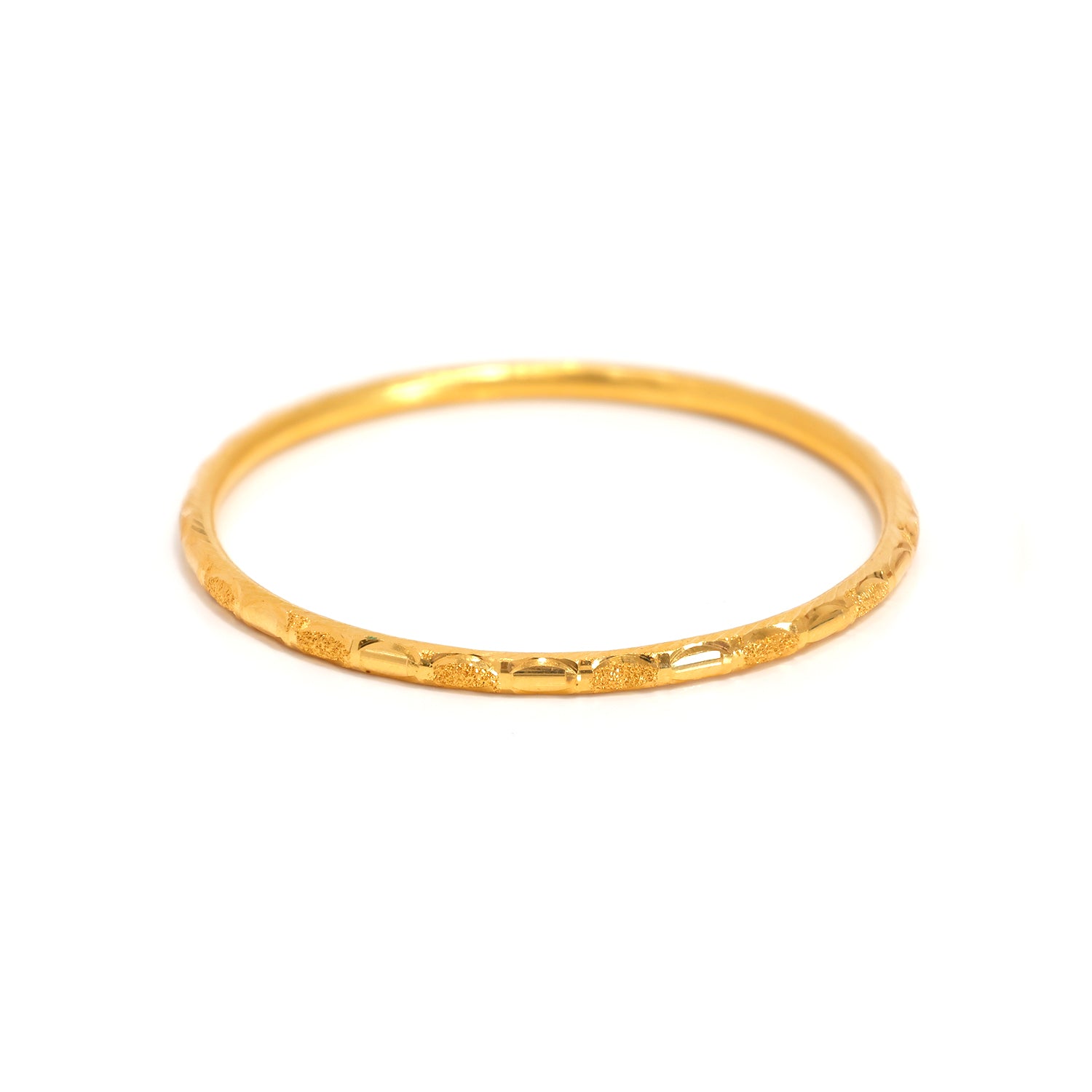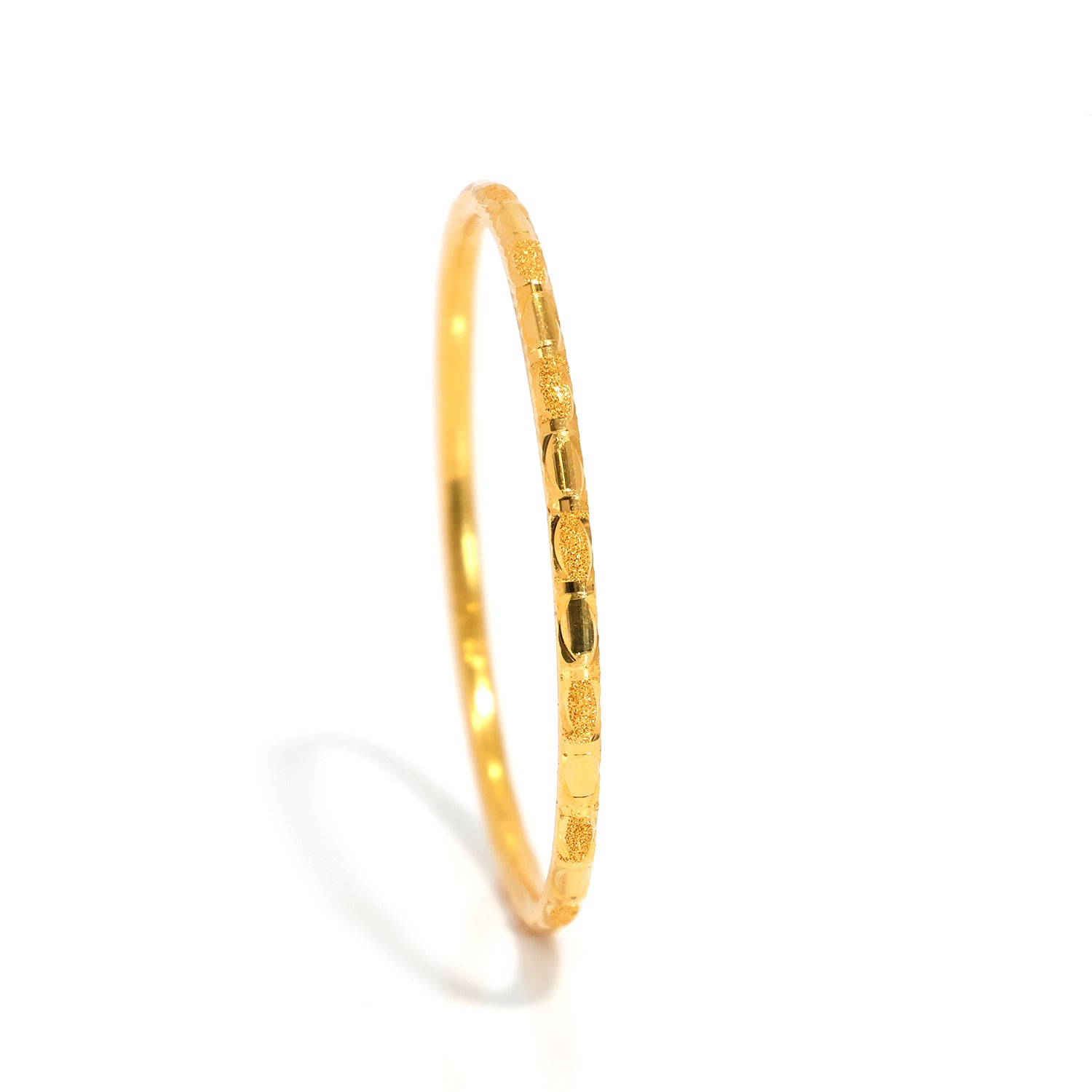 Refined, modern, and irresistibly stackable, this 21K gold bangle features a striking contrast of polished smooth sections and textured patterned links. Each segment catches the light differently, creating a subtle shimmer with every movement.ย Designed for effortless everyday elegance, the slim profile makes it ideal to wear solo for a minimal look or stacked for a bold layered style. A durable gold alloy ensures lasting shine and daily comfort.