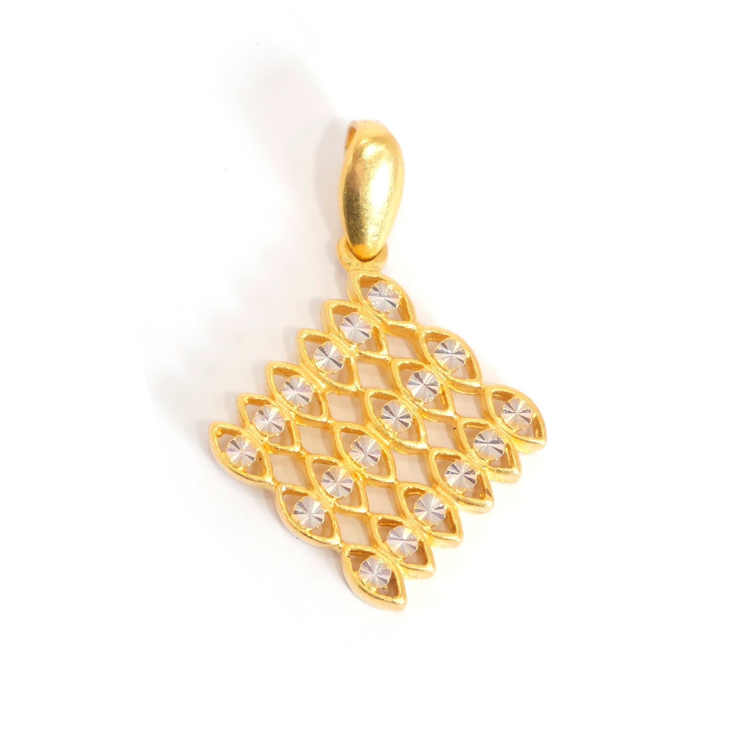 A classic 22K gold pendant with a distinctive presence. Featuring geometric diamond lattice pendant finished with alternating polished disc details. Crafted to shine beautifully with minimal effort and maximum elegance.