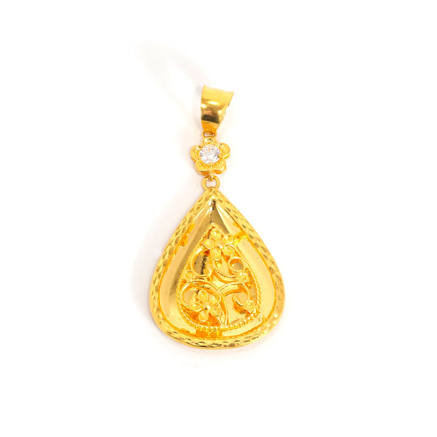 This yellow-tone 22K gold pendant features a refined high-polish elongated drop, designed to complement both everyday and occasion wear.