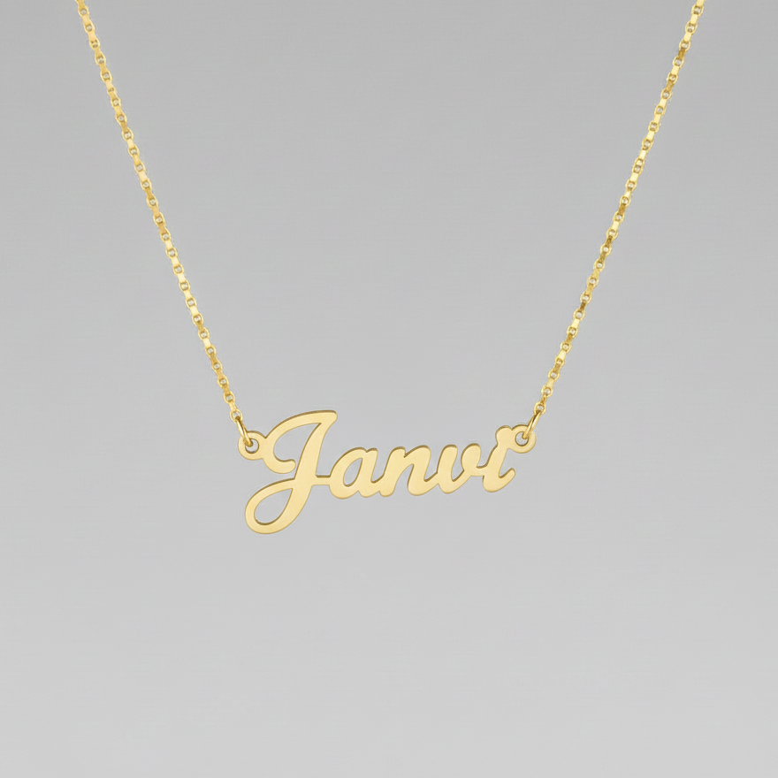A traditional 21K gold name necklace with rich color and elegant detailing
